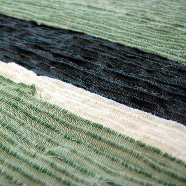 Das Design zeichnet sich durch eine gleichmäßige, horizontale Legetechnik aus Webkanten aus, ergänzt durch eine ausgewogene Akzentlinie, die im goldenen Schnitt des Teppichs platziert ist. Ein Zusammenspiel aus strahlendem Weiß und sattem Dunkelgrün akzentuiert die zentrale Lichtgrünfläche und verleiht dem Teppich lebendige Tiefe.