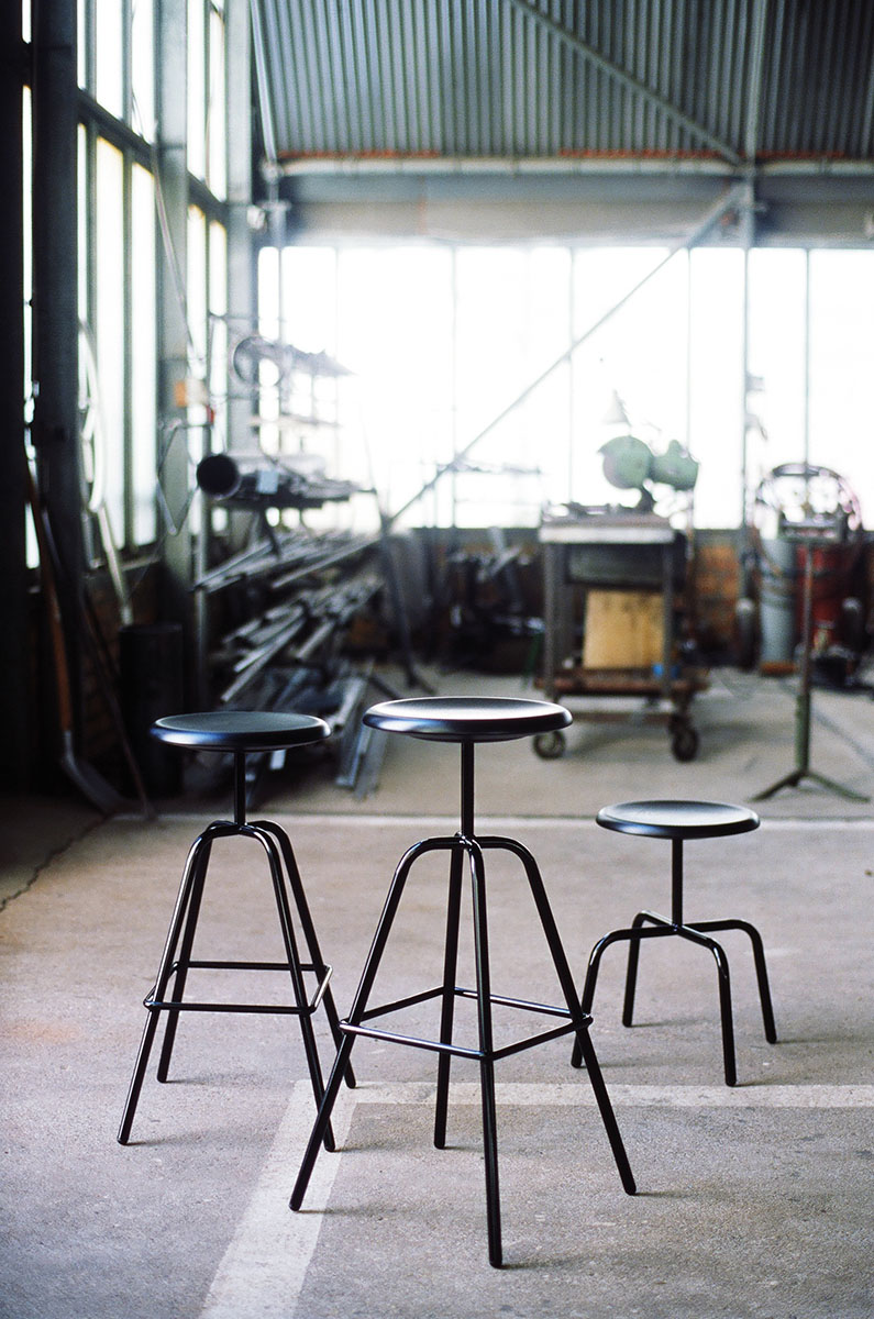 Inspiriert von den Industrieentwürfen der 30er Jahre hat Andreas Haußmann den Herrenberger Hocker entworfen. Der präzise gefertigte Hocker ist robust und funktional. Die Stahlrohrkonstruktion auf vier Beinen ist pulverbeschichtet. Durch das schlichte Design lässt sich der Hocker in fast alle Wohn- und Arbeitsbereiche integrieren. Die gedrechselte Sitzschale aus Massivholz bietet durch ihre gewölbte Form den gewünschten Sitzkomfort.