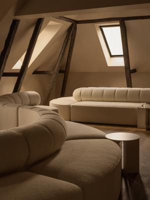 Eave Seamline ist vollständig gepolstert und in verschiedenen Modulen erhältlich, die individuell kombiniert oder als vorkonfigurierte Sofas gewählt werden können. So entsteht eine flexible Lösung für private Wohnräume ebenso wie für Lobbys, Lounges oder repräsentative Empfangsbereiche.
