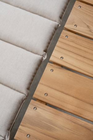 Die Bank dieser Serie ist auf stabilen Beinen montiert, die bei Bedarf leicht in der eleganten Sitzfläche aus Lamellen verschwinden können, um die Bank platzsparend zu verstauen. Für zusätzlichen Sitzkomfort sind gepolsterte Sitzauflagen erhältlich.