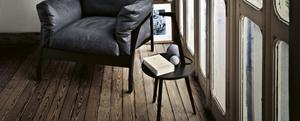 Der Beistelltisch ist in amerikanischem Nußbaum, Esche natur oder Esche schwarz gebeizt erhältlich.