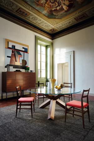Die skulptural anmutende Basis mit den Diagonalen ist das charakteristische Merkmal von La Rotonda. Die Gestellblöcke sind aus Massivholz. Dieser runden Tisch lädt zu geselligen Runden.