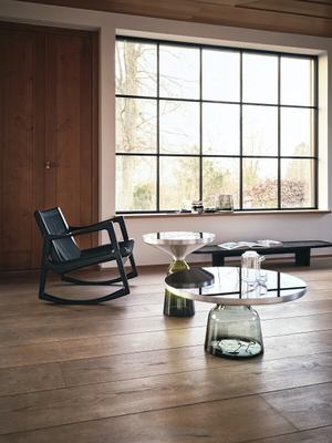 Bell überrascht in der Wahrnehmung, denn es ist kein gewöhnlicher Umgang mit Materialien. Metall trifft auf Glas - der Tischfuß imponiert als prägnante Glasform im Raum, wohingegen ein schwerer Metallkörper aufliegt. Das Glas lässt diesen Metallaufsatz schwebend wirken und mit Leichtigkeit bestehen.