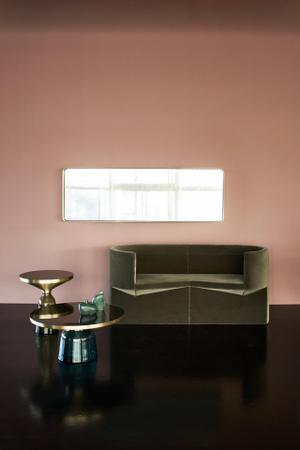 Harmonisch ausgeformte Radien und ein Messingrahmen erinnern an die Eleganz der 50er Jahre. Die österreichische Architektin Nina Mair lässt den Cypris Spiegel seitlich betrachtet mit Präsenz und einem ausdrucksstarken Rahmen erstrahlen.