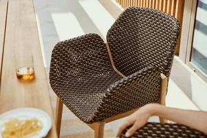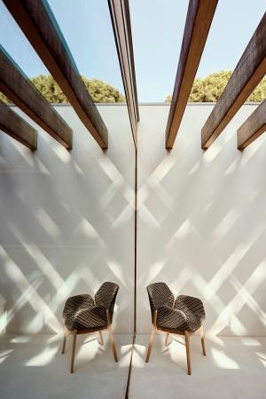 Die CALADIO-Kollektion zelebriert echtes Handwerk mit kunstvoll komponierten Geflechtdetails: Drei verschiedene DEDON-Fasern werden zu einer nahtlosen Sitzschale verwoben, die Sitzfläche, Arm- und Rückenlehne umschließt und eine einladend komfortable Form ergibt.