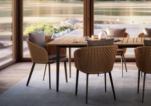 Sebastian Herkner, einer der aufstrebenden, jungen deutschen Designtalente, hat mit seinem Konzept für die Kollektion Mbrace in einzigartiger Weise Barefoot-Luxury interpretiert. Eine geflochtene Sitzschale wird auf eine solide Teakholzbasis gesetzt – eine gelungene und neue Materialkombination im Dedon Portfolio. Daraus entstanden ist eine Kollektion mit einem Hochlehner, einem Sessel, einem Schaukelstuhl, ein Armlehnstuhl sowie einem Hocker. Nomen est omen – und so steht die Mbrace Kollektion voll und ganz für die Einladung, die bereits in ihrem Namen steckt.