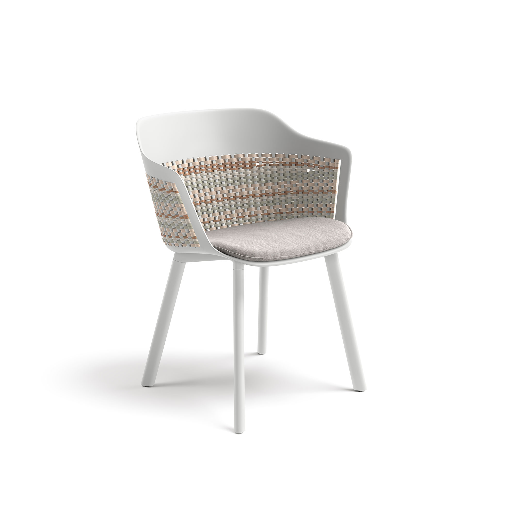 Die fein strukturierte DEDON-Faser verleiht dem Stuhl Tiefe und eine angenehme Haptik, während die sorgfältig ausgearbeiteten Armlehnen zusätzlichen Komfort bieten. Getragen wird die filigrane Silhouette von schlanken Beinen, die dem Stuhl Stabilität verleihen und seinen zeitlosen Charakter unterstreichen.
