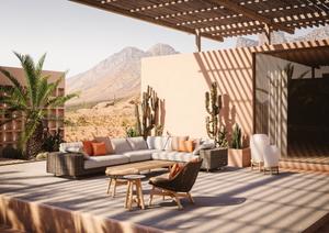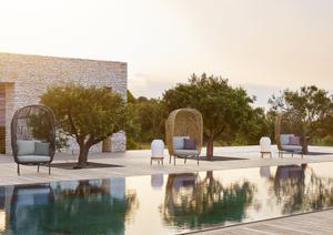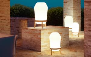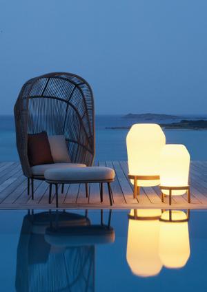Die Loon Bodenleuchten mit edlem Teakholzgestell und einem ballonähnlichem Leuchtkörper sind die elegante Ergänzung zur Lounge im Außenbereich. Das Licht taucht die Umgebung in warme Farben.