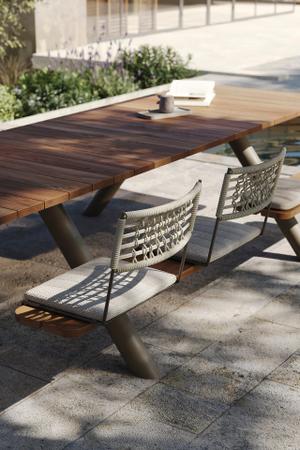 Auch bei der Bestuhlung zeigt sich Panigiri anpassungsfähig: Wählen Sie zwischen fest integrierten Bänken oder kombinieren Sie lose Stühle und Sitzkissen – ganz nach Anlass und Atmosphäre. Für noch mehr Komfort lässt sich sogar eine gewebte Rückenlehne ergänzen. Die Gestaltungsmöglichkeiten sind nahezu unbegrenzt.