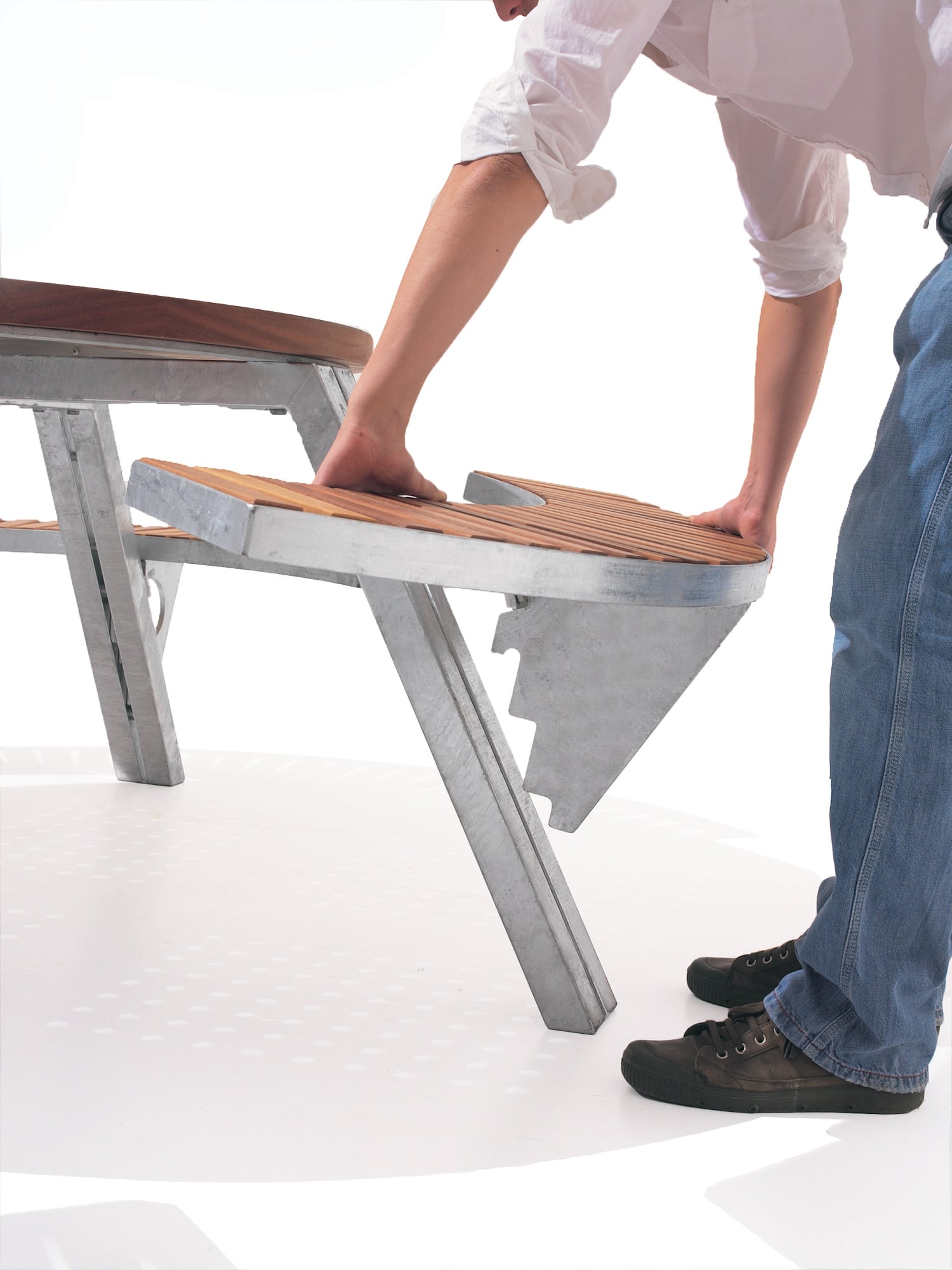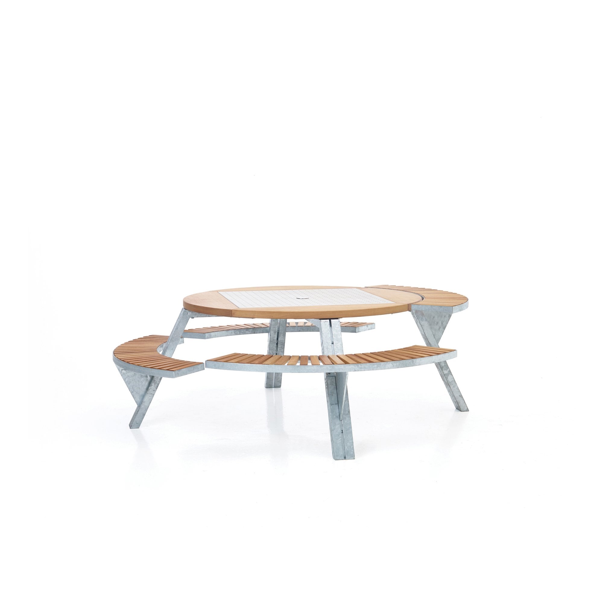 Der Picknicktisch Gargantua von Extremis ist ein beeindruckender, großer runder Tisch für den Außenbereich, der durch seine überlegene Funktionalität besticht. Die herausragende Besonderheit dieses Tisches sind seine vier höhenverstellbaren Bänke. Diese Flexibilität ermöglicht es Ihnen, die Bänke nach Bedarf anzupassen und zu bewegen, was das Hinsetzen und Aufstehen erheblich erleichtert. In der höchsten Position erweitern die Bänke die Tischplatte und bieten so Platz für bis zu 12 Personen – ideal für größere Zusammenkünfte im Freien.