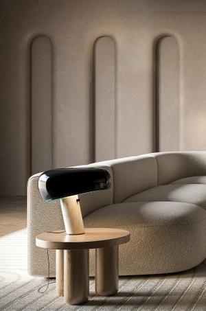 Die Tischleuchte Snoopy sorgt für direktes Licht mit lackiertem Sockel und weißem Marmorfuß.