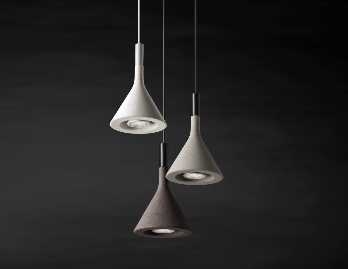 Der für Leuchten ungewöhnliche Werkstoff Beton wird von Paolo Lucidi und Luca Pevere mit der Hängeleuchte Aplomb in ein elegantes Design umgesetzt. Die einzigartige Optik verleiht dem Raum einen zeitlosen Charme und eine moderne Architektursprache.