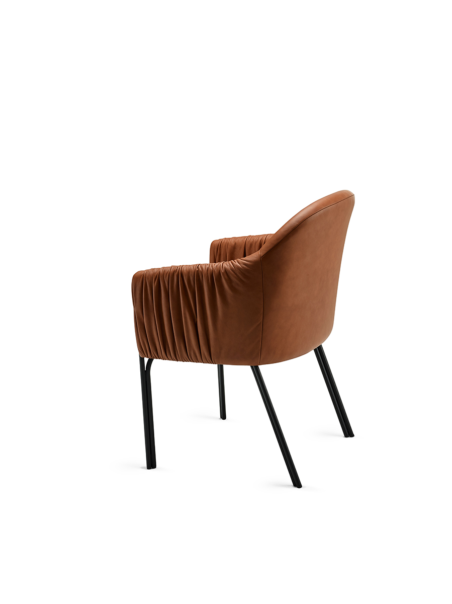Lucie Koldova ist der kreative Kopf der Brokis Leuchten. Für Freifrau entwarf sie ihren ersten Polsterstuhl. Das geraffte Material an den Armlehnen und die straffe Polsterung im Sitz und Rücken machen den Stuhl so charmant.