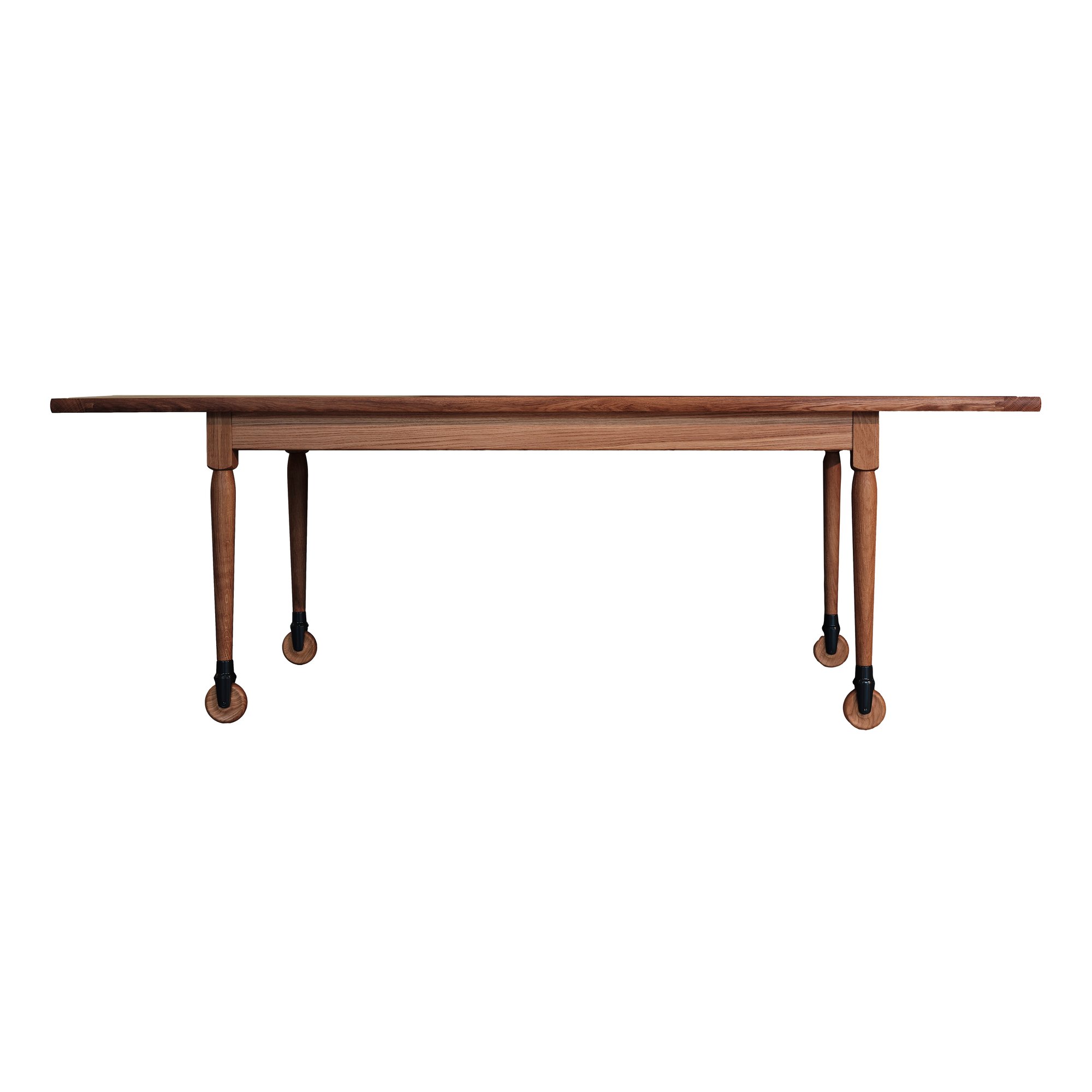 Das durchdachte Konstruktionsprinzip ermöglicht Stabilität und Langlebigkeit. Charakteristisch sind die sichtbar gezapften Verbindungen, Stirnleisten und die starr montierten Rollen aus Metall. Diese ermöglichen eine einseitige Beweglichkeit des Tisches, ohne seine Standfestigkeit zu beeinträchtigen.