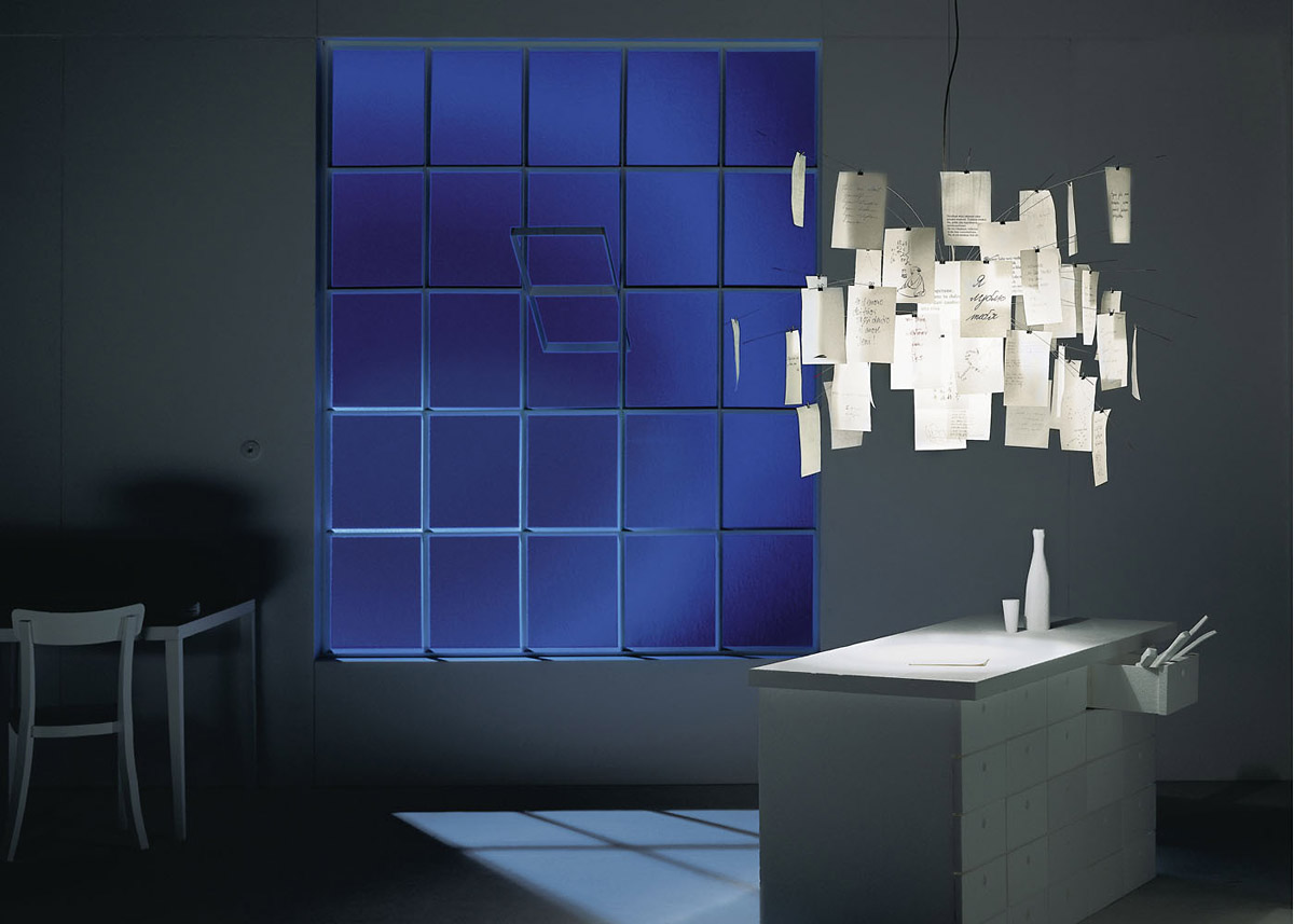 Sie ist eine der bekanntesten Lampen von Ingo Maurer: die Zettel'z 5 lässt dem Anwender sehr viel Spielraum für eigene Kreativität. Die mitgelieferten Blanko-Zettel aus japanischem Papier können für eigene Messages oder Skizzen genutzt werden. Das Papier ist sehr dünn, transluzent und sorgt gemeinsam mit den zwei Leuchtmitteln für ein gutes Licht.