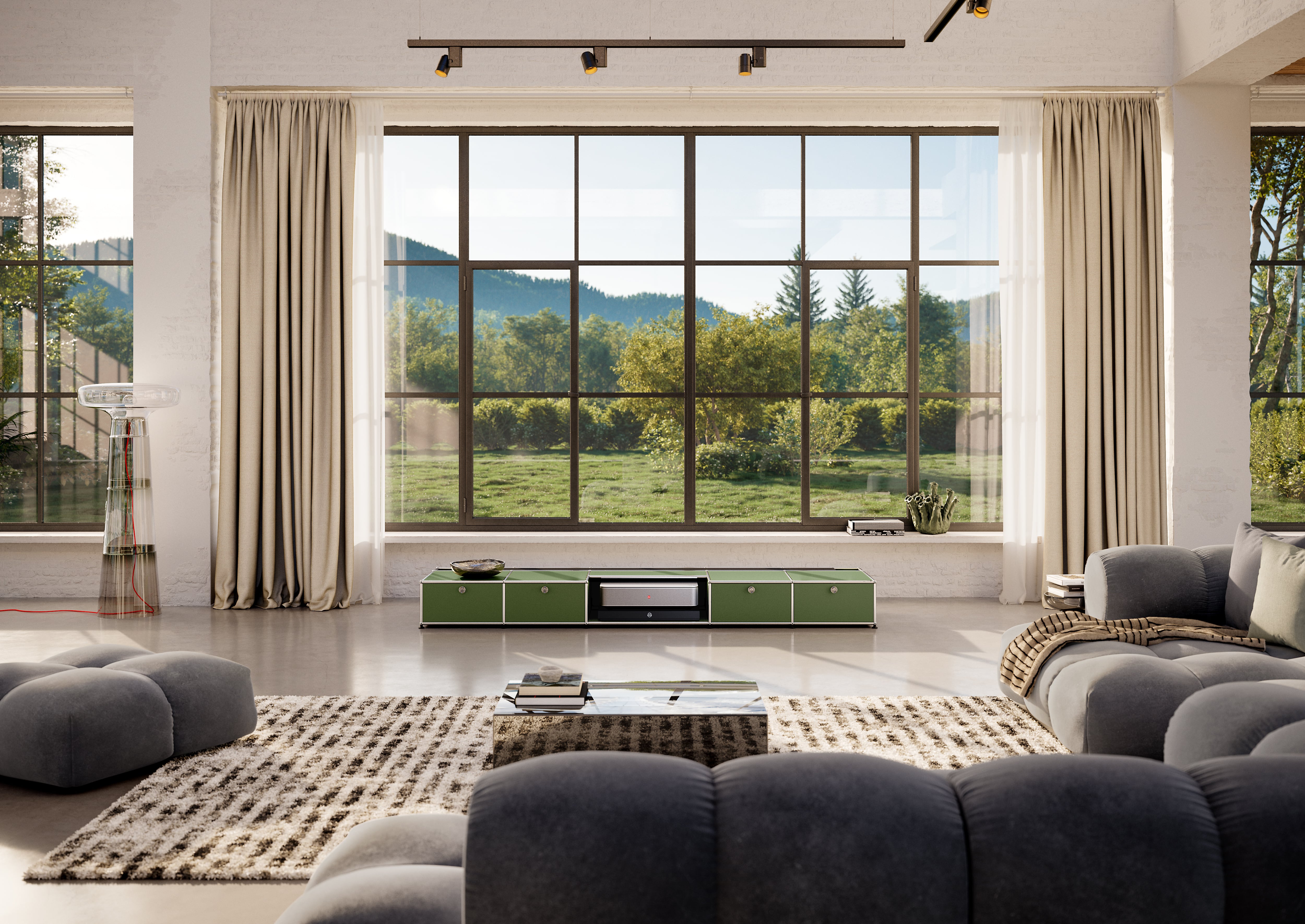 Für zeitgemäße Arbeitsbereiche wurde eine Serie modularer USM Sideboards entwickelt, die den Leica Cine 1 integriert aufnehmen. Sie ordnen den Arbeitsplatz und schaffen eine ruhige, aufgeräumte Umgebung. Eine gezielt konzipierte Front verdeckt dabei Technik, Anschlüsse und Kabelführung, sodass der Fokus auf dem Wesentlichen bleibt.