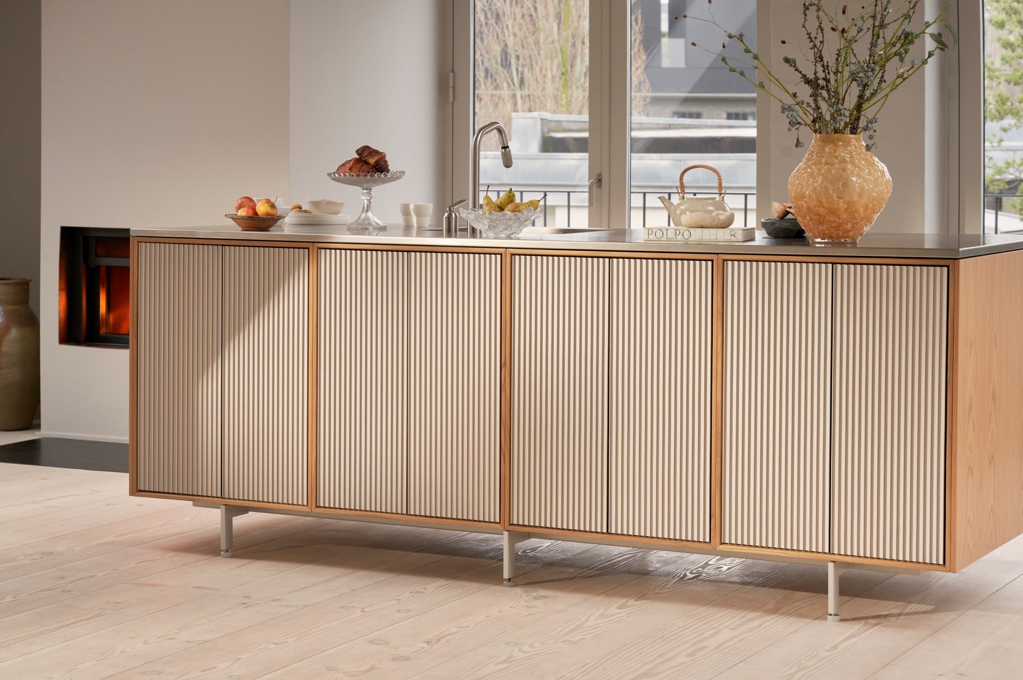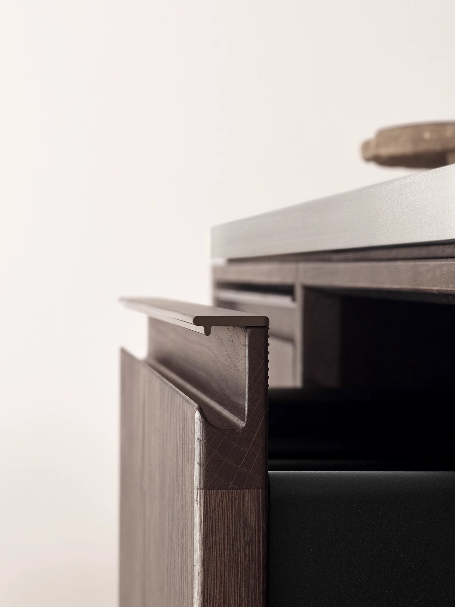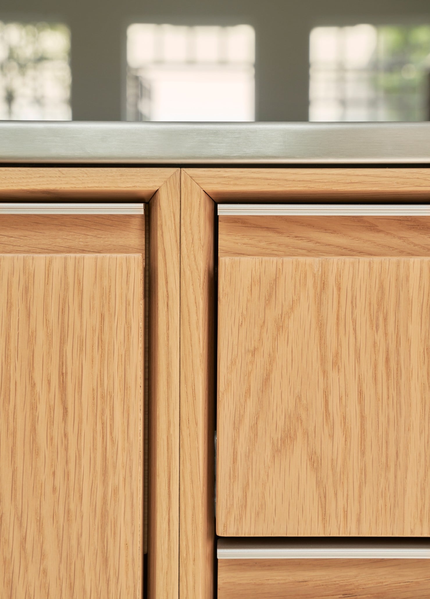 Eiche markiert eine neue Materialrichtung für Vipp-Küchen, während der charakteristische Einsatz von Edelstahl und stranggepresstem Aluminium – bekannt aus unseren Architekturprojekten und Produktdesigns – für langanhaltende Robustheit sorgt.