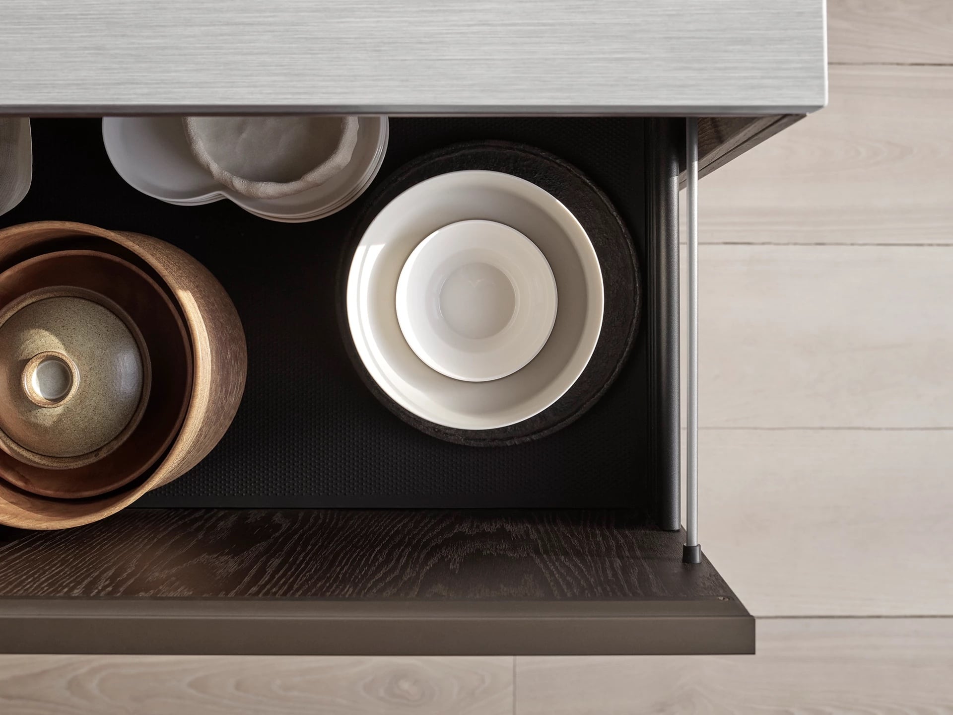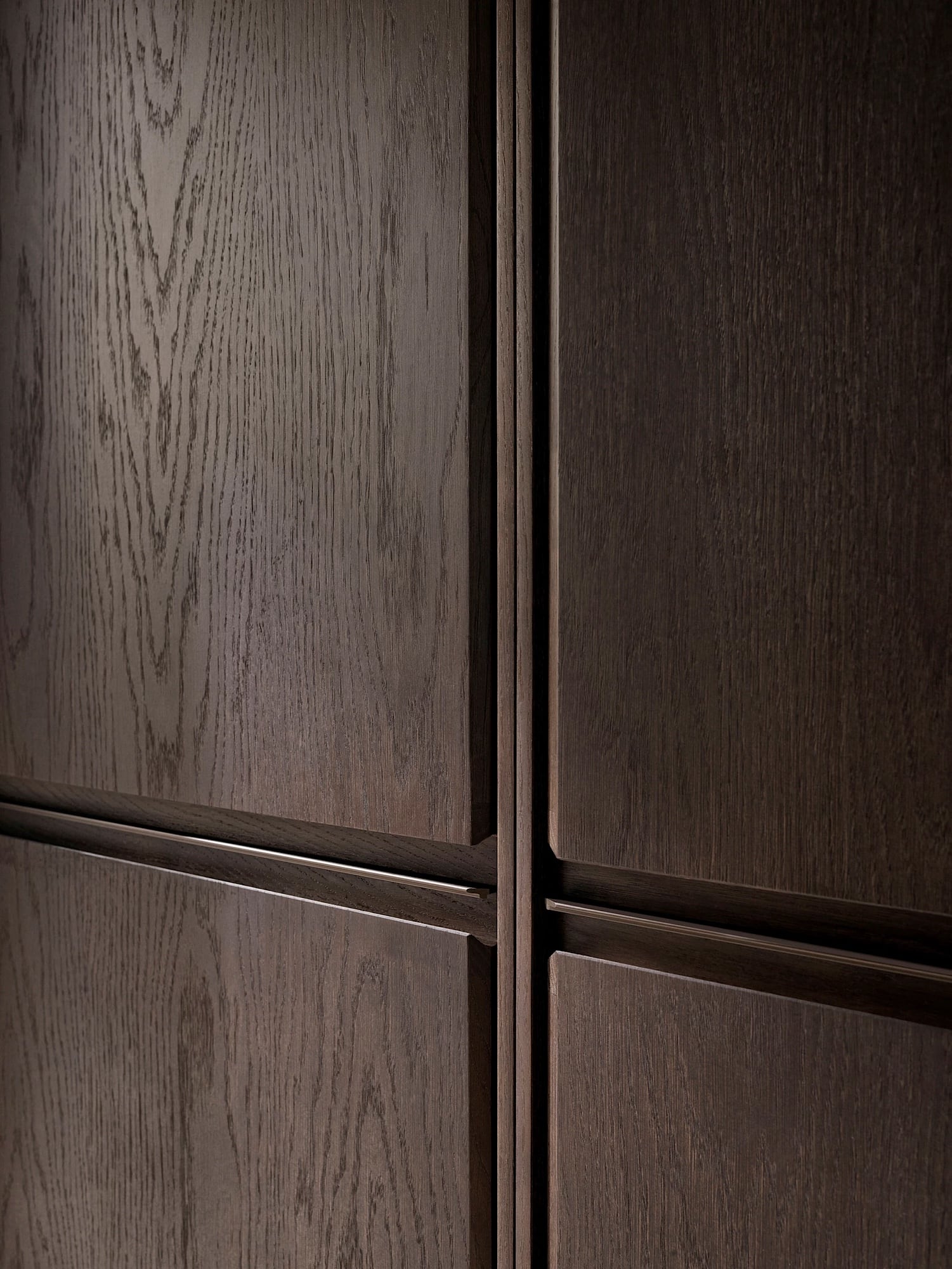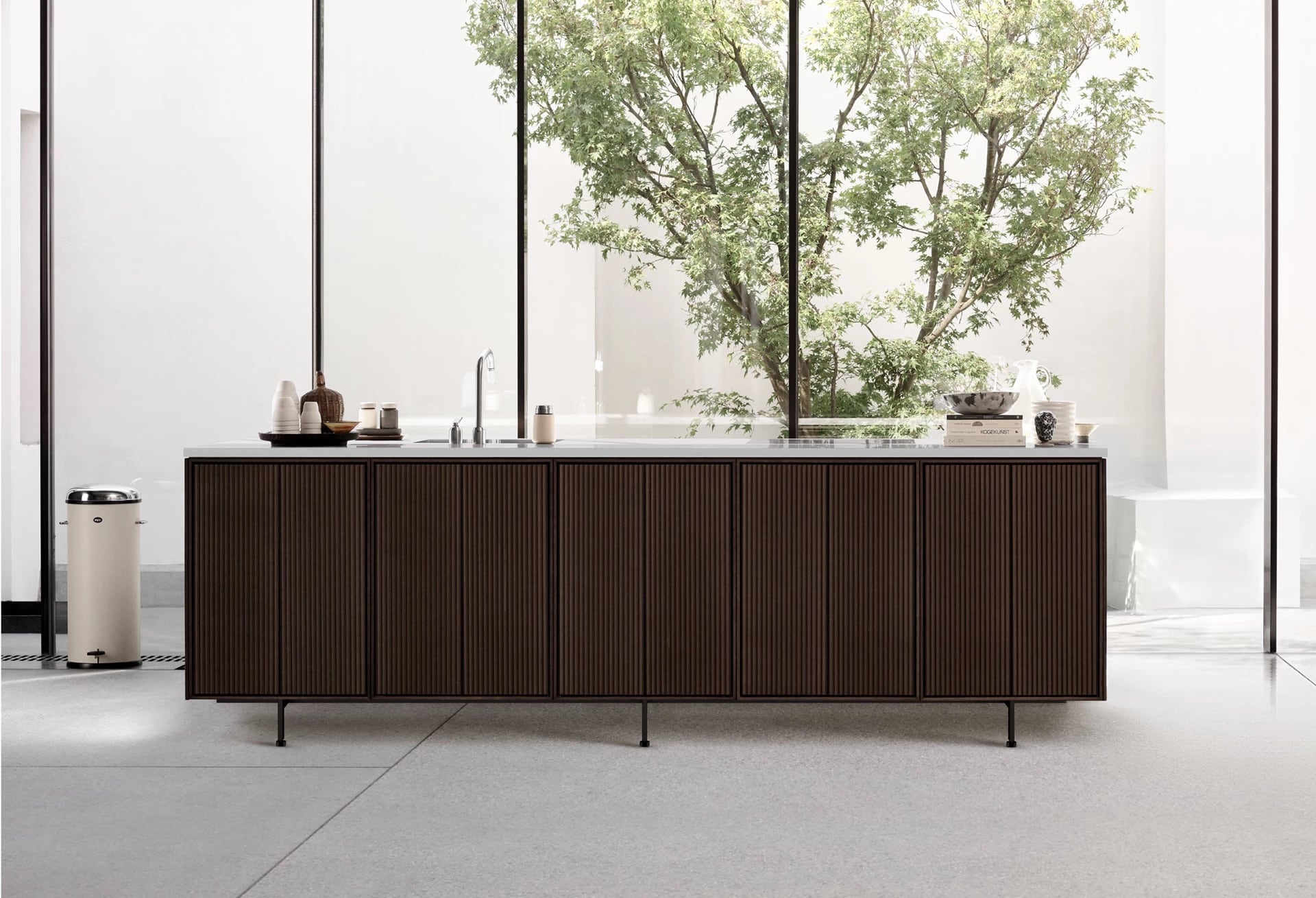 Eiche markiert eine neue Materialrichtung für Vipp-Küchen, während der charakteristische Einsatz von Edelstahl und stranggepresstem Aluminium – bekannt aus unseren Architekturprojekten und Produktdesigns – für langanhaltende Robustheit sorgt.