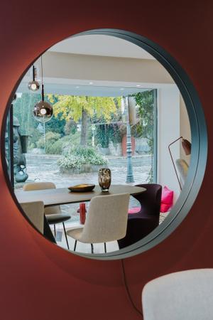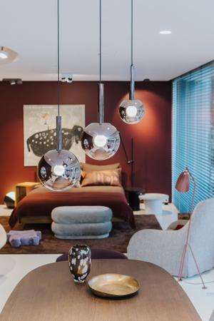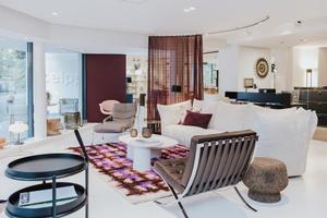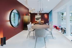 Im Zentrum steht das Sofa Standard von Edra, weich und expressiv zugleich. Ihm gegenüber entfalten der Sessel Maggiolina von Zanotta und der Sessel Barcelona Relax von Knoll International ihre zeitlose Eleganz. Der Esstisch Bridge von Zoom by Mobimex wird begleitet von den Stühlen Rely von &tradition – moderne Klassiker, die mit ihrer klaren Formensprache und feinen Details Leichtigkeit und Komfort verbinden. Die Hängeleuchte Luna Cloud 3 von Occhio taucht die Szene in sanftes, stimmungsvolles Licht und setzt die warmen Farbtöne subtil in Szene.
