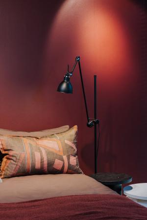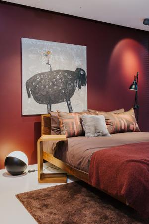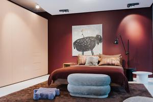 Im Schlafbereich schaffen das Bett Simple von Zeitraum und der Schrank Nex von Piure in zartem Blush eine Atmosphäre von Leichtigkeit und Ruhe. Dazu kommt die Kommode Marea von De Castelli, deren Außenkörper aus Messing schimmert und dem Raum subtile Wärme verleiht. Der Spiegel Fullmoon und die Beistelltische Louisa von Molteni & C. mit ihren Zementplatten runden das Ensemble ab. Kunst und Textur verbinden sich im Bild von Alexandra Huber, während Teppiche von CS Rugs und CC-Tapis für weiche Bodenstimmung sorgen.