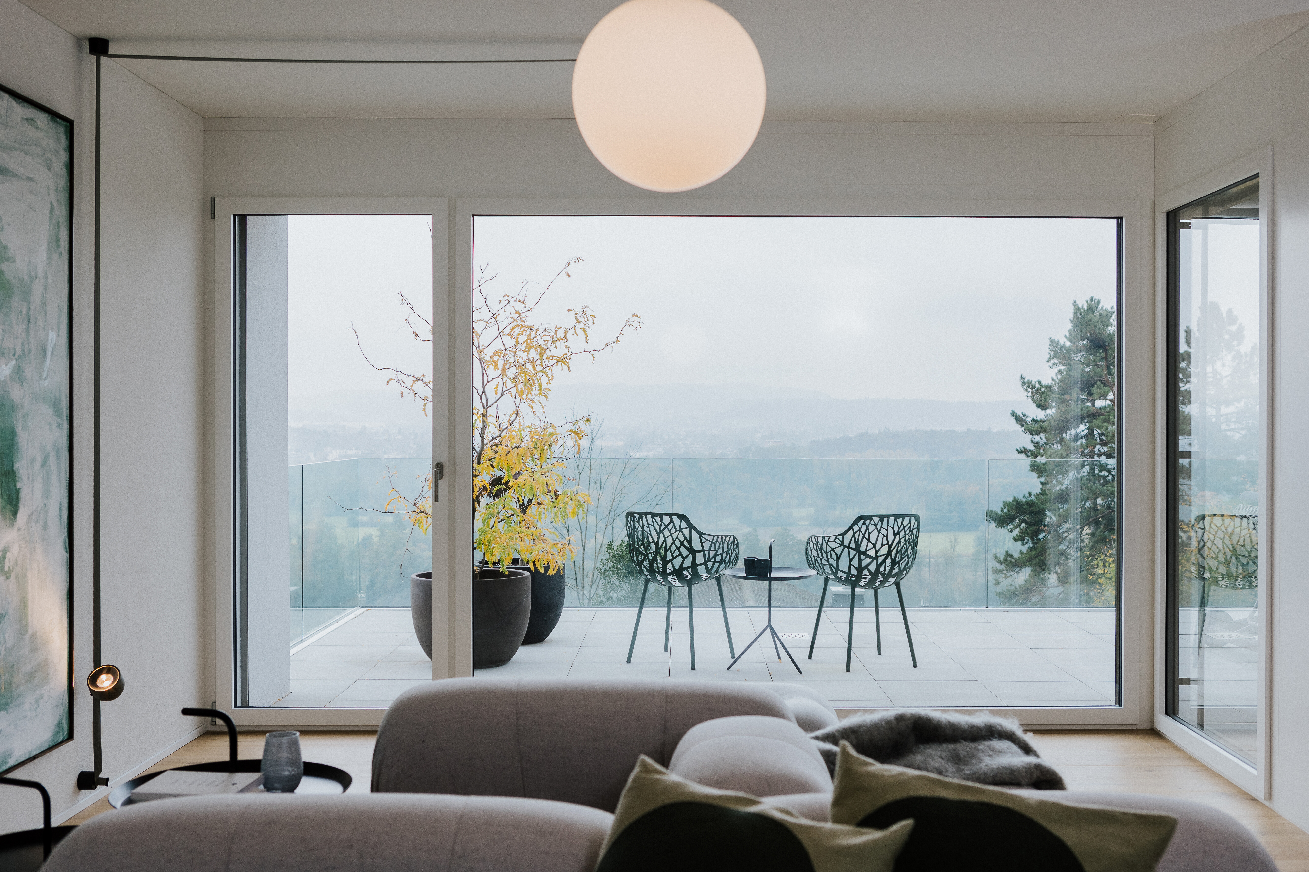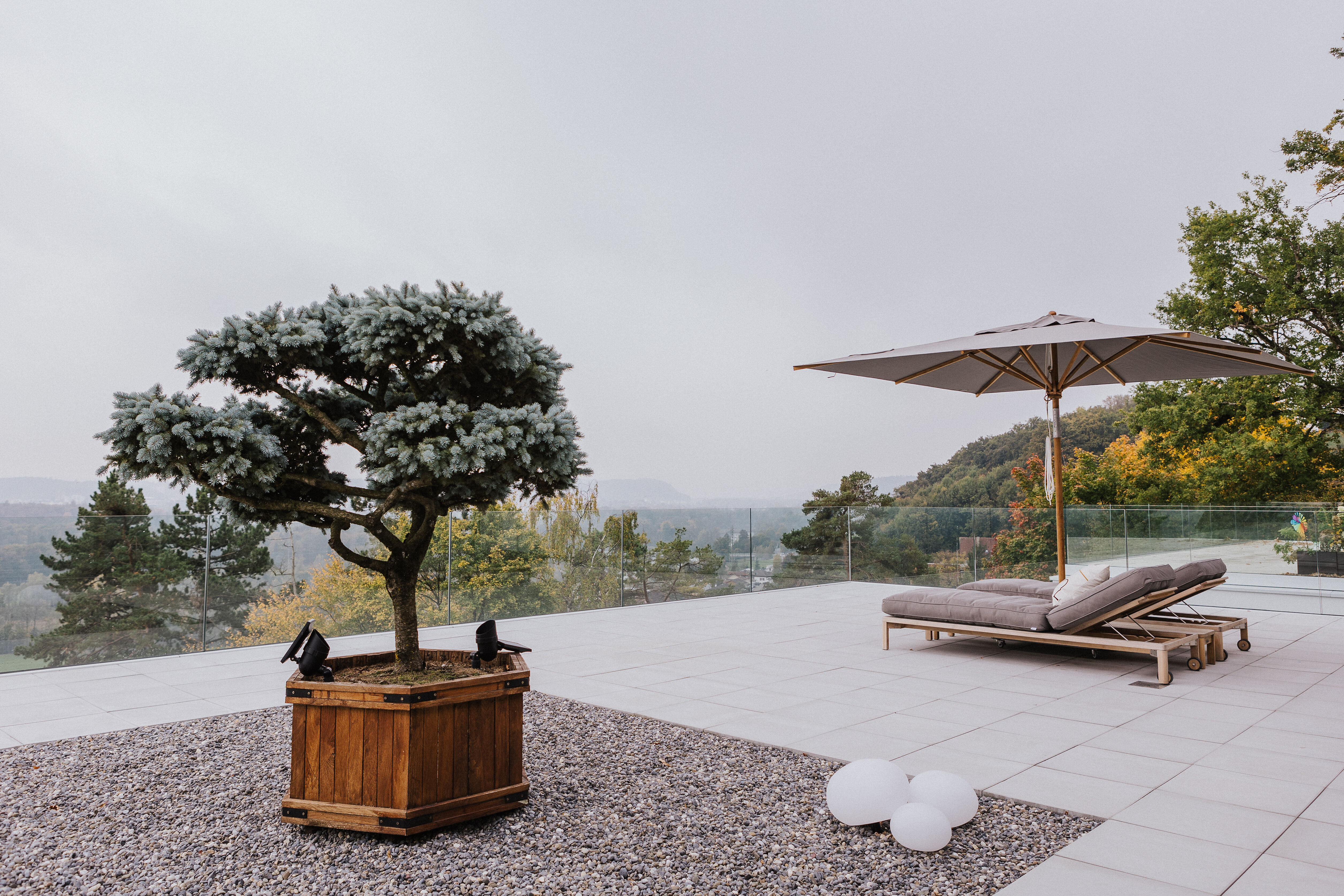 Die großzügige Sonnenterrasse eröffnet einen atemberaubenden Ausblick und lädt dazu ein, die Gedanken schweifen zu lassen. Bequem entspannen lässt es sich auf den Liegestühlen New Hampton, die höchsten Komfort bieten. Der edle Teak-Sonnenschirm auch von Weishäupl spendet angenehmen Schatten und fügt sich harmonisch in das natürliche Ambiente ein. Die Verbindung zwischen Innen- und Außenbereich gelingt mühelos mit dem Outdoor-Sessel Forest von Fast, der gemeinsam mit dem Beistelltisch DLM von Hay eine stilvolle Sitzgruppe bildet – ein perfekter Ort, um die Natur in vollen Zügen zu genießen.