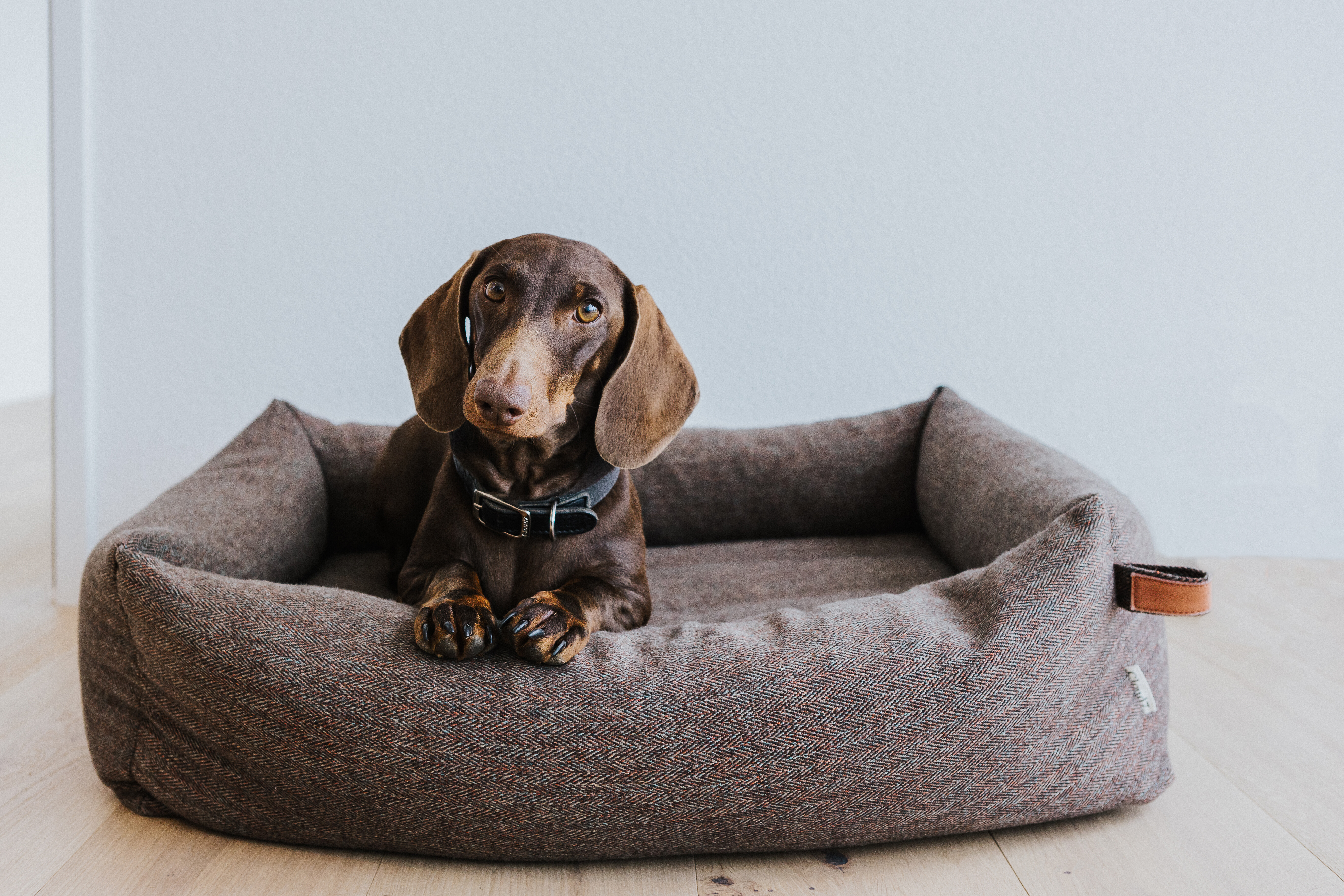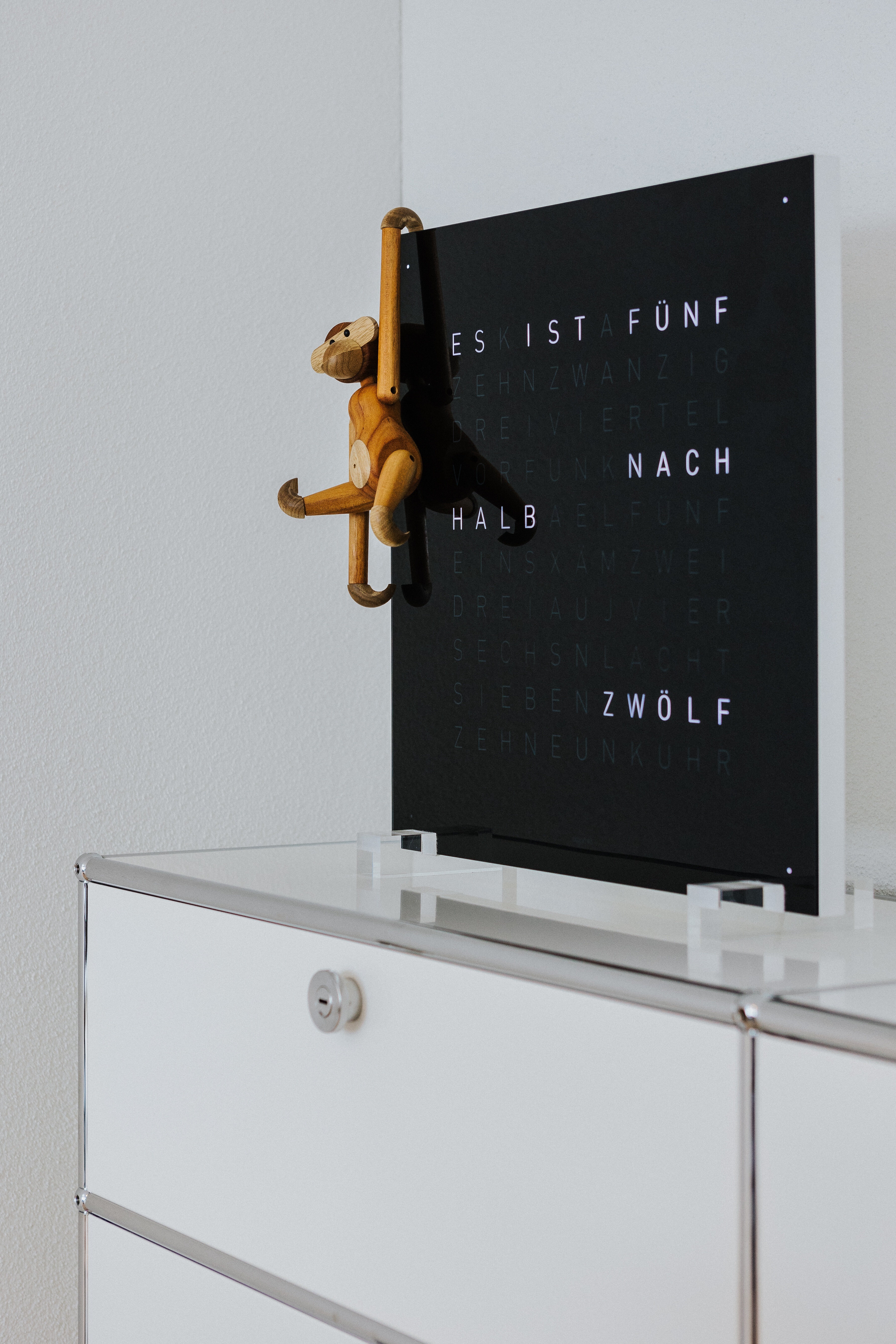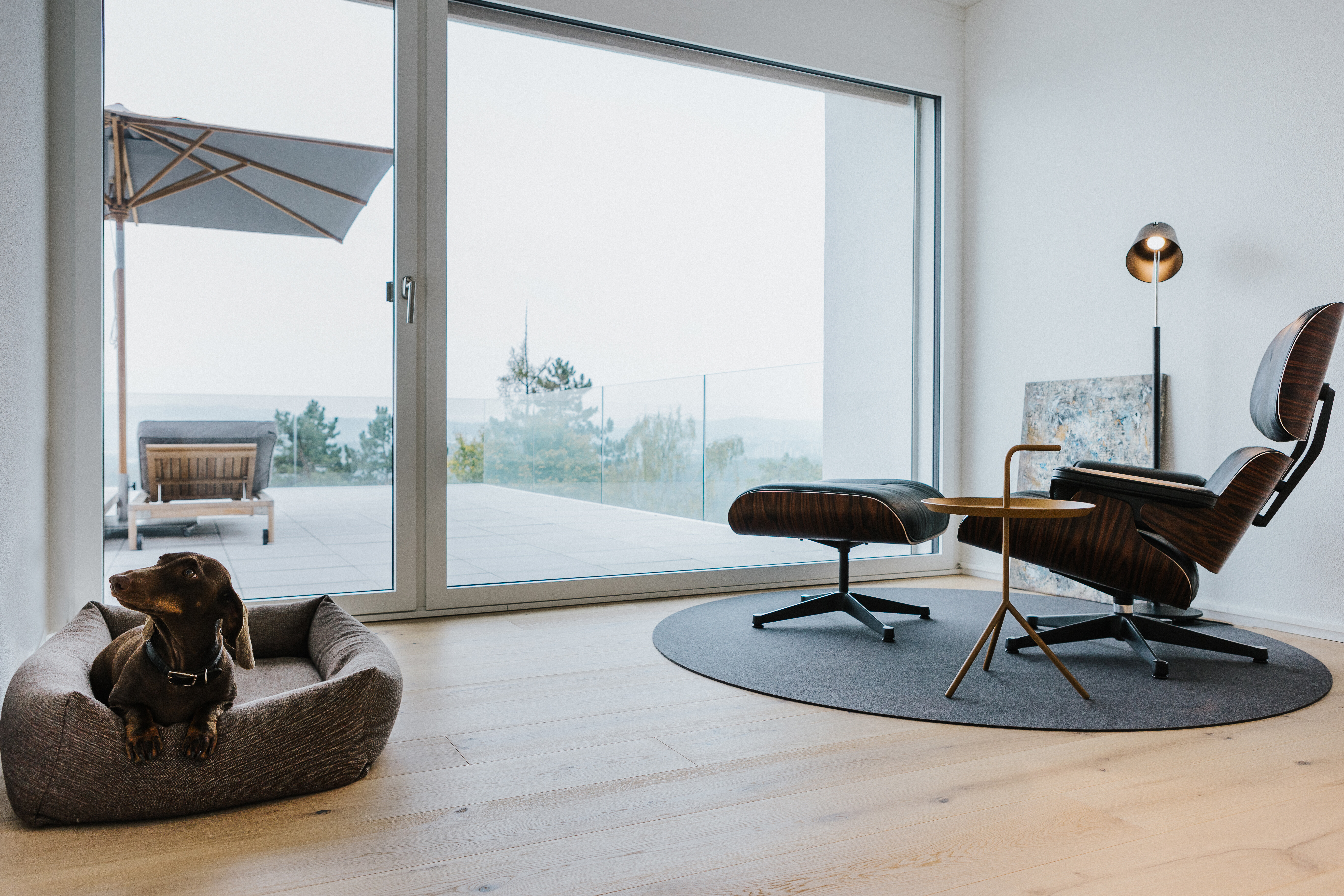 Ein inspirierender Arbeitsplatz mit großzügiger Fensterfront, der viel Licht und Ruhe für produktives Arbeiten bietet. Der funktionale Tisch und das Sideboard von USM Haller sorgen für eine durchdachte Ordnung, während der Tisch Copenhague von Hay als stilvolle Arbeitsfläche dient. Die ikonische Tischleuchte AJ von Louis Poulsen bringt gezieltes Licht auf den Arbeitsplatz, und die Tischuhr Qlocktwo setzt ein kunstvolles Statement. Für kurze Pausen lädt das Querschläfersofa Tamino von Franz Fertig zum Entspannen ein – ein Ort, an dem selbst der Dackel des Hauses seinen Ruheplatz findet, gebettet auf einem stilvollen Hundebett von Cloud7.