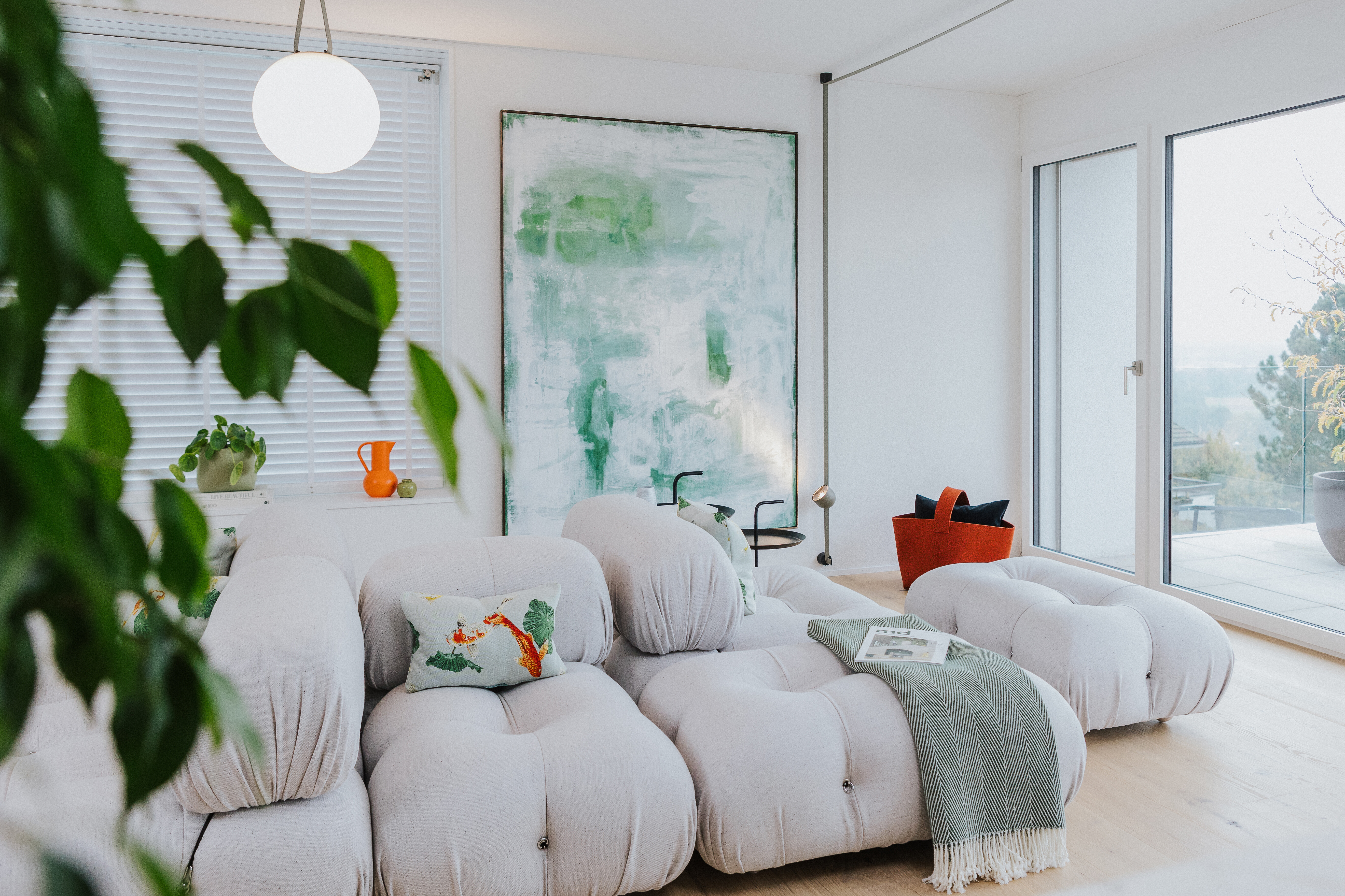 Die Polstergruppe Camaleonda von B&B Italia in sanften, gedeckten Tönen fügt sich harmonisch in den Wohnraum ein und schafft eine entspannte Atmosphäre. Teppiche aus Filz sowie dekorative Kissen setzen feine Akzente und sorgen für eine warme, wohnliche Stimmung. Der Holzboden verstärkt dieses Gefühl von Geborgenheit und Natürlichkeit.