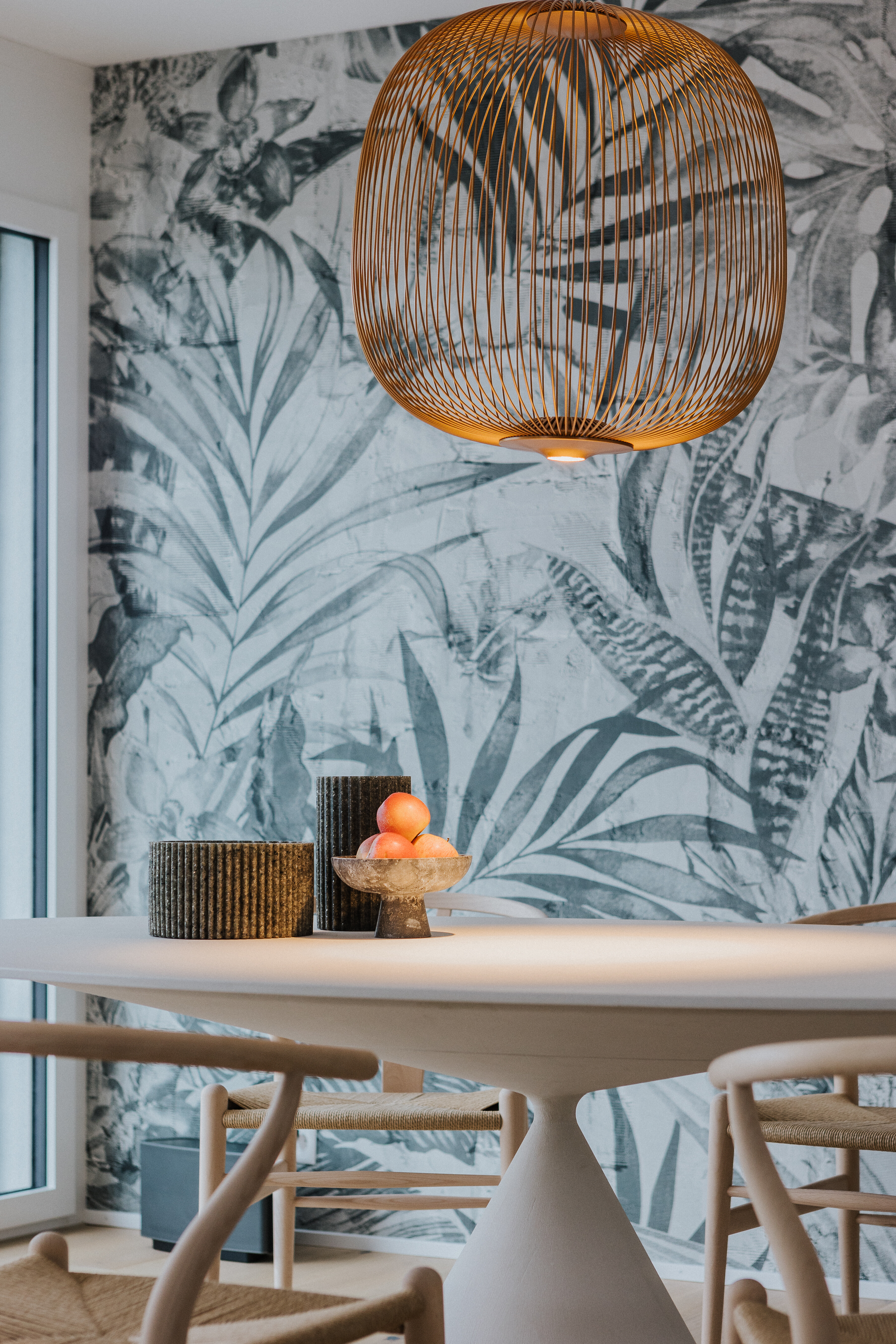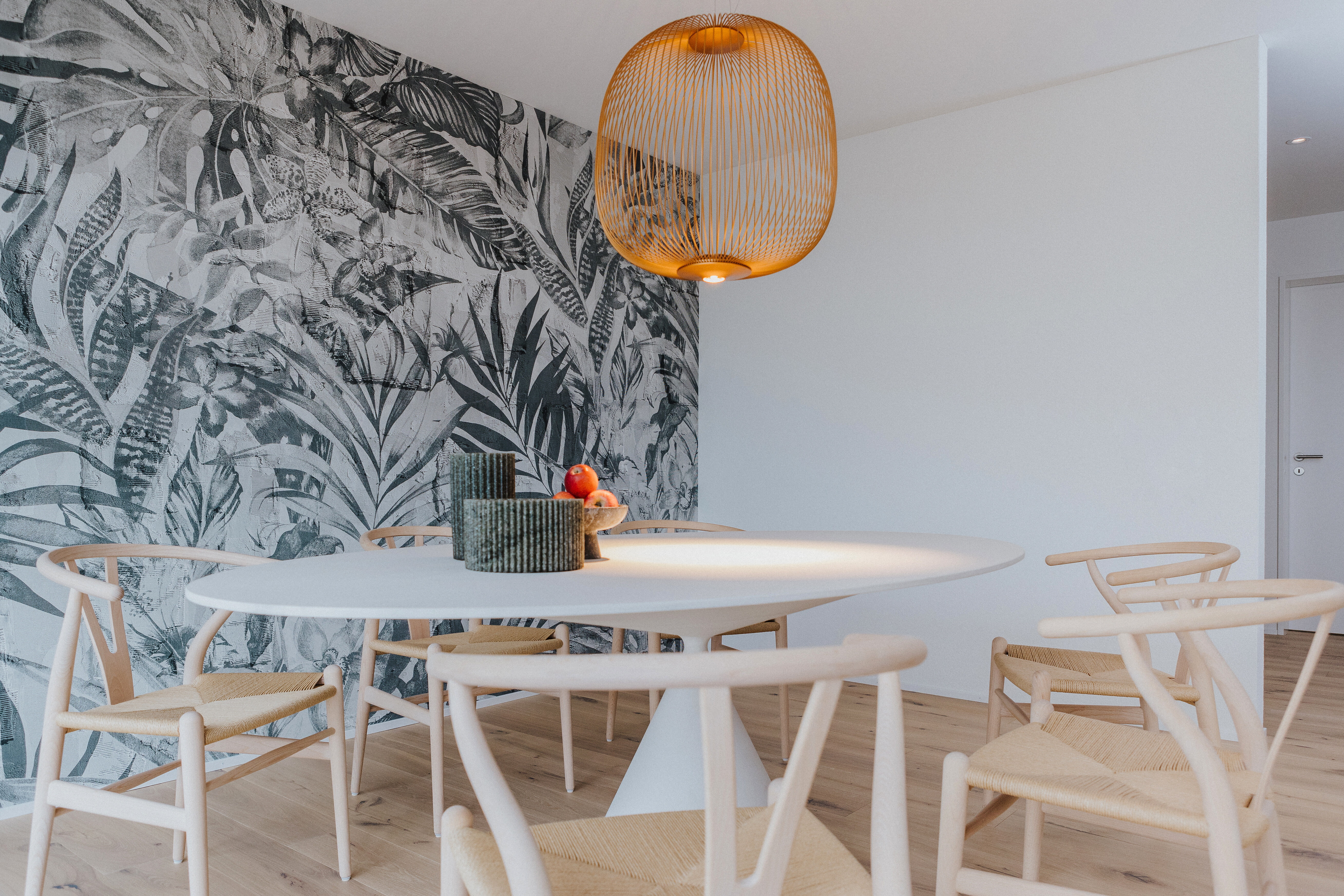 Der offene Essbereich mit dem ovalen Esstisch Clay von Desalto lädt zu geselligen Runden ein. Umgeben von den zeitlosen Y-Chairs von Carl Hansen entsteht hier eine Kombination, die sowohl elegant als auch einladend wirkt. Die Hängeleuchte Spokes von Foscarini setzt einen filigranen Lichtakzent und lässt den Raum erstrahlen.