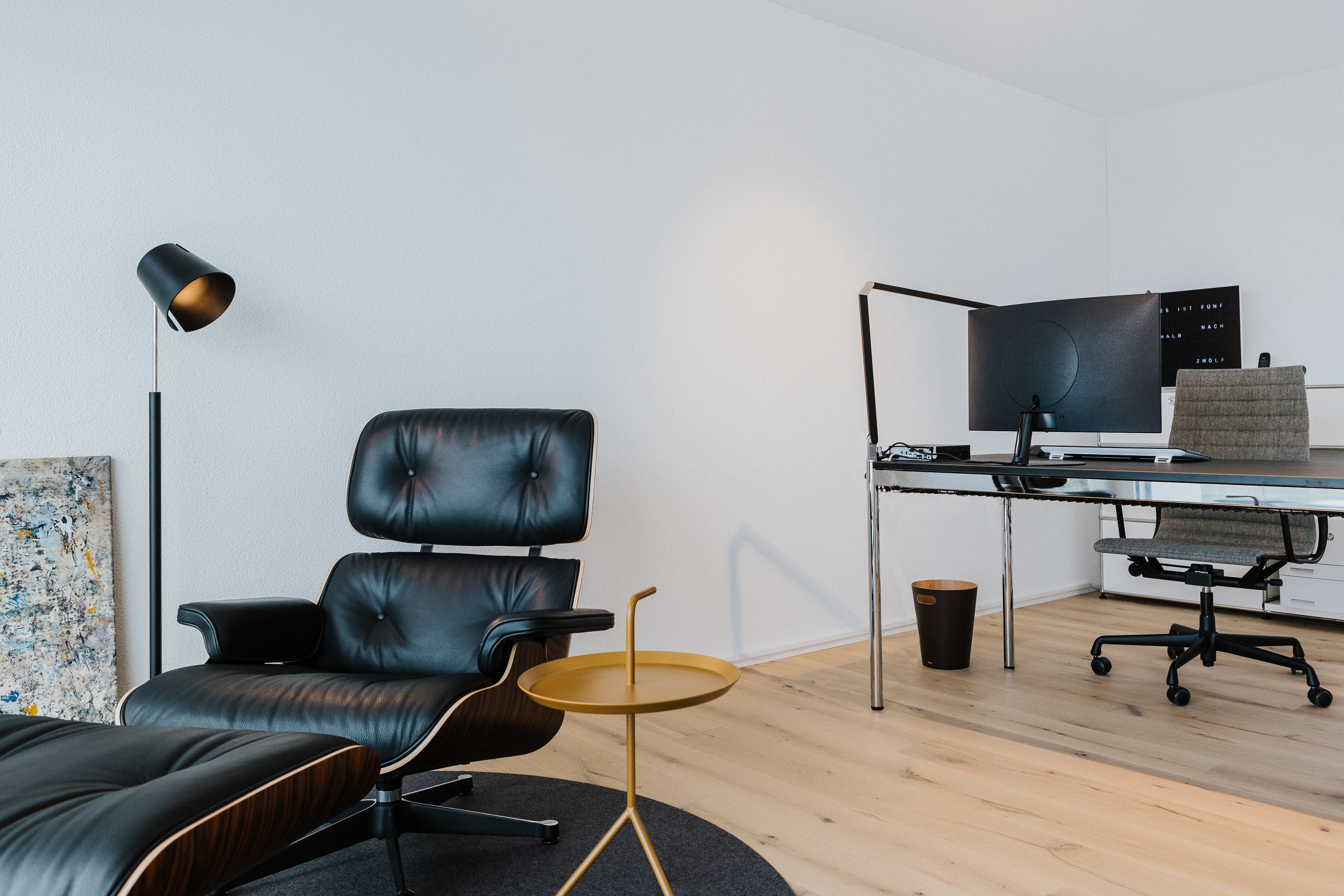 In der angrenzenden Lesezone entsteht eine behagliche Rückzugsmöglichkeit: Der Lounge Chair von Vitra bietet höchsten Komfort, während die Leseleuchte Fez von Baltensweiler für punktgenaues Licht sorgt. Ein Teppich Bigdot von Hey Sign verleiht dem Bereich eine weiche, angenehme Haptik.