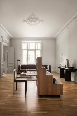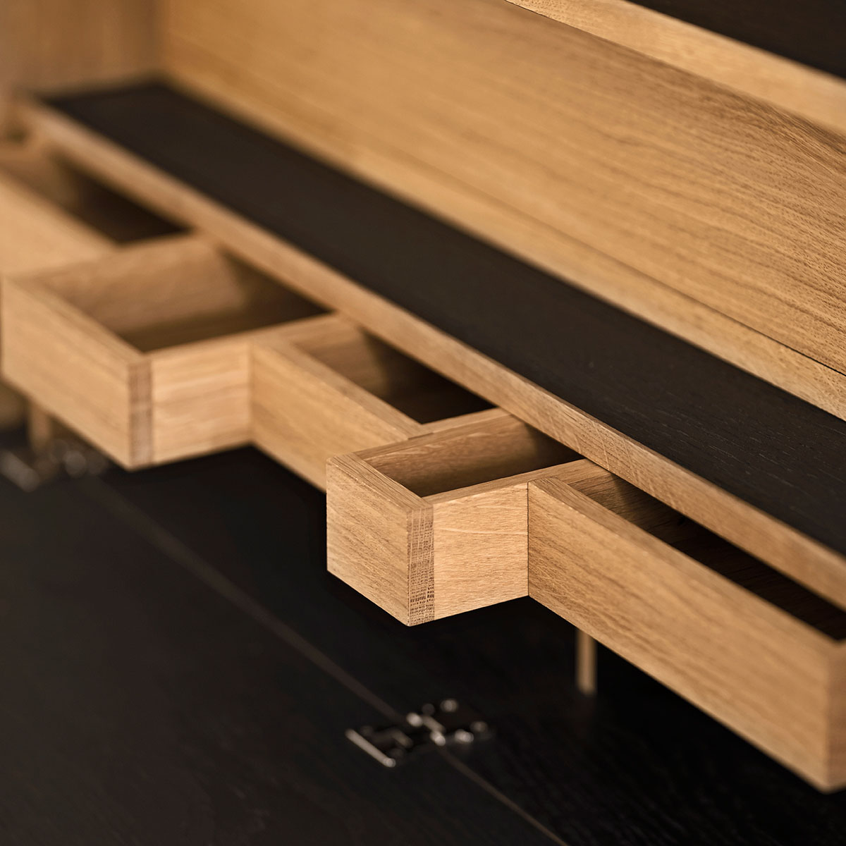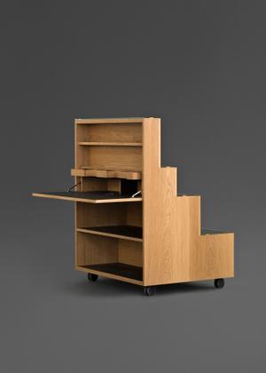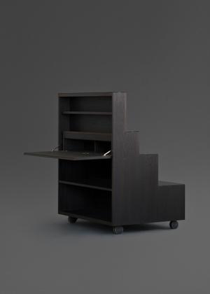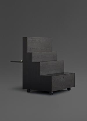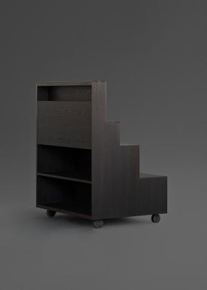 Auf einer Seite dienen die Stufen als Bücherregal, wobei die vier Stufen mit gehärteten Glasplatten bedeckt sind. Ein Fach in der unteren großen Stufe wird mit einer Klappentür verschlossen. Auf der gegenüberliegenden Seite von Rampa befinden sich zwei sichtbare Fächer zur Aufbewahrung sowie eine größere Klappe, die beim Öffnen als Schreibtisch fungiert und zwei weitere Fächer und sechs Schubladen freigibt. Dank der vier Rollen, von denen zwei gebremst sind, kann das Objekt leicht bewegt oder fixiert werden.