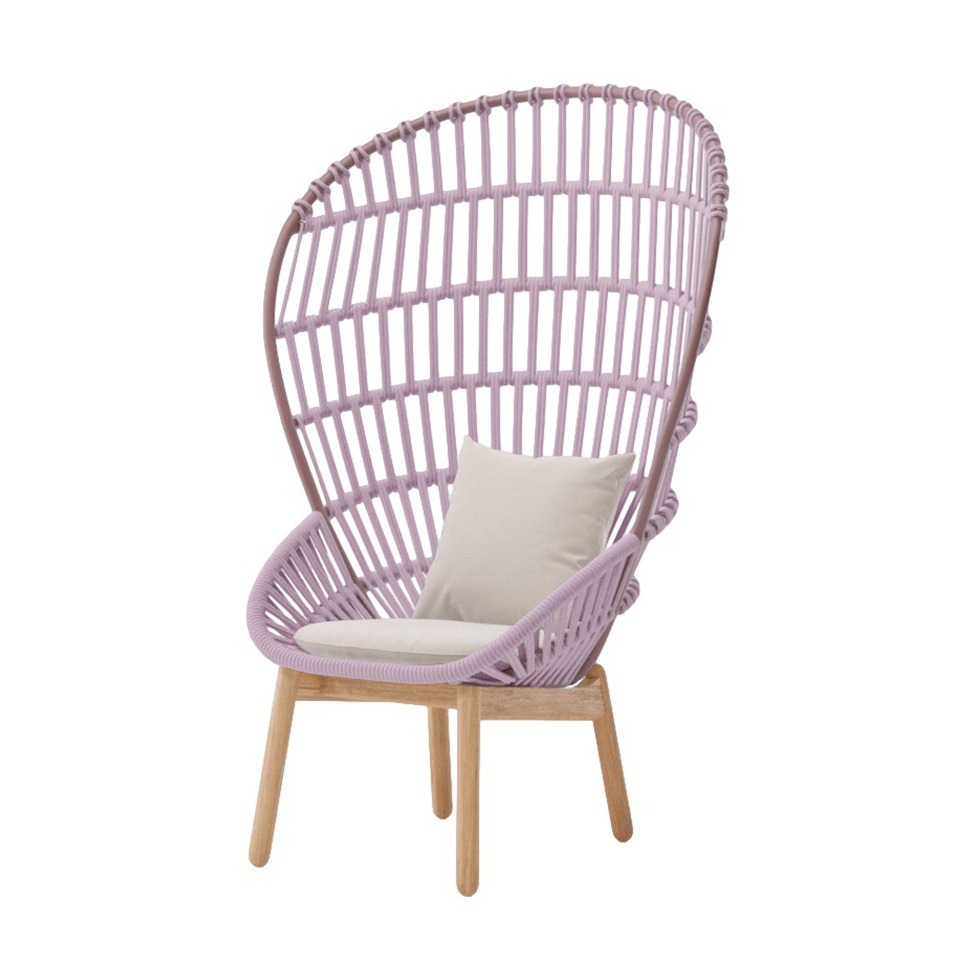 Der Sessel Cala von Kettal, inspiriert vom ikonischen Emmanuelle, besticht durch seine hohe Rückenlehne und seine majestätische räumliche Präsenz. Die transparenten, leichten Oberflächen des offenen Seilgeflechts schaffen eine gitterartige Struktur, die sowohl Blickschutz bietet als auch die Verbindung zur natürlichen Umgebung aufrechterhält.