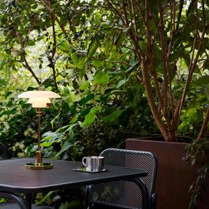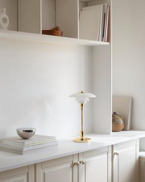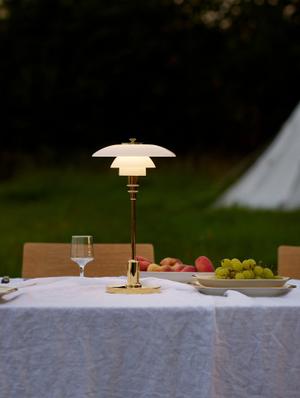 Die PH 2/1 Akkuleuchte von Louis Poulsen ist eine moderne, kabellose Version der ikonischen Leuchte von Poul Henningsen. Das dreischirmige Opalglas-System sorgt für weiches, gleichmäßiges und blendfreies Licht, das Wärme und Atmosphäre schafft. Ihr Standfuß aus Messing oder verchromtem Metall und die mundgeblasenen Glaselemente machen sie zu einem stilvollen Detail in jedem Raum – drinnen wie draußen. Die kabellose Technik und dimmbare Lichtleistung unterstützen flexible Nutzung an verschiedenen Orten
