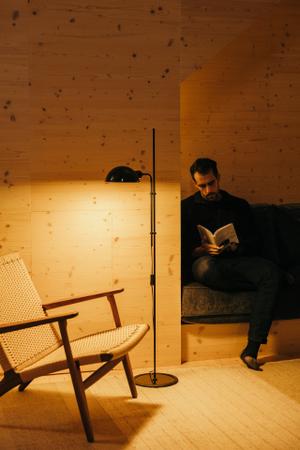 Die 2012 Neuauflage des Entwurfes von 1979 ist schlicht gehalten. Die höhenverstellbare und drehbare Stehleuchte ist formschön und stabil.