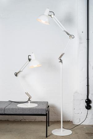 Die Federzugleuchte war in den 50er Jahren ein Meilenstein in der Geschichte des lenkbaren Lichts. Die Stehleuchte mit der beweglichen Zwei-Armlösung ist flexibel positionierbar.