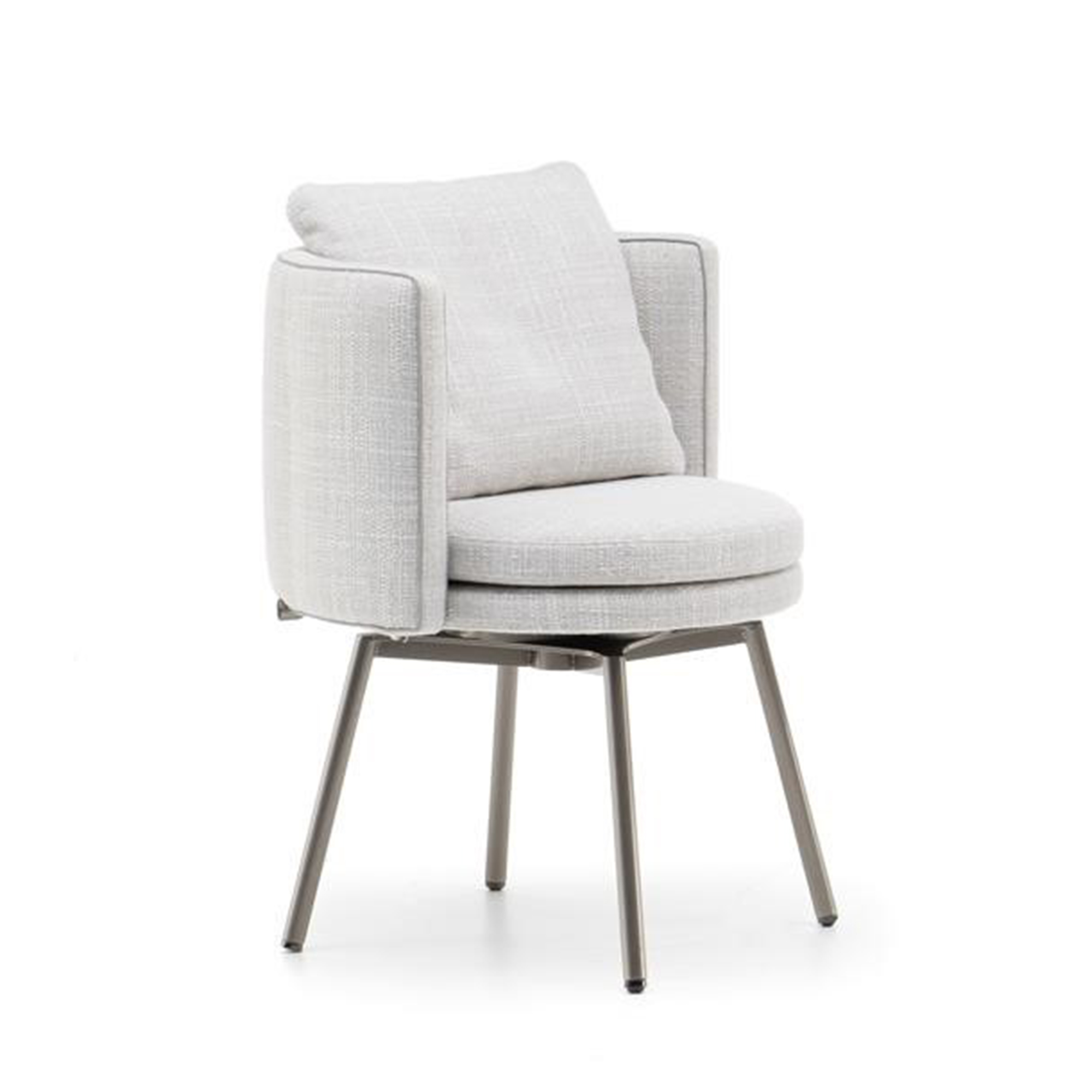 Der Stuhl verfügt über eine dünne Rückenlehne mit vertikalen Stepplinien und einem Keder am Polsterrand. Die Polsterung kann individuell angepasst werden und ist in hochwertigen Stoffen oder Leder erhältlich.