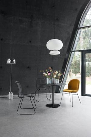 Der 1955 von Verner Panton entworfene Stuhl sorgt für ein behagliches Sitzgefühl, am Ess- oder Besprechungstisch gleichermaßen.