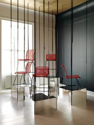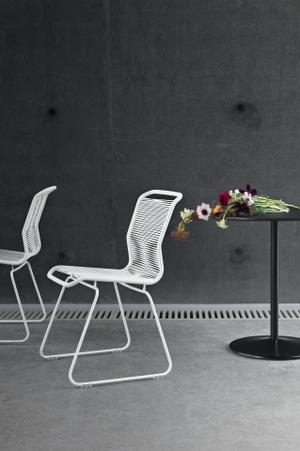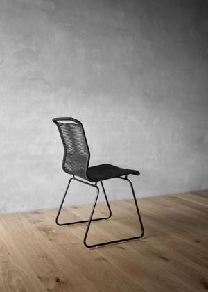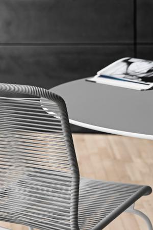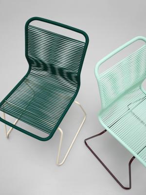 Die von Hand geflochtenen Polyurethanschnüre bilden Sitz und Rücken dieses Stuhles. Die Schnüre sind UV-geschützt. Verfärbungen der Schnüre durch direkte Sonneneinstrahlung über lange Zeit sind jedoch vorbehalten. Das Gestell aus Edelstahl ist für Innen wie für Außen geeignet.