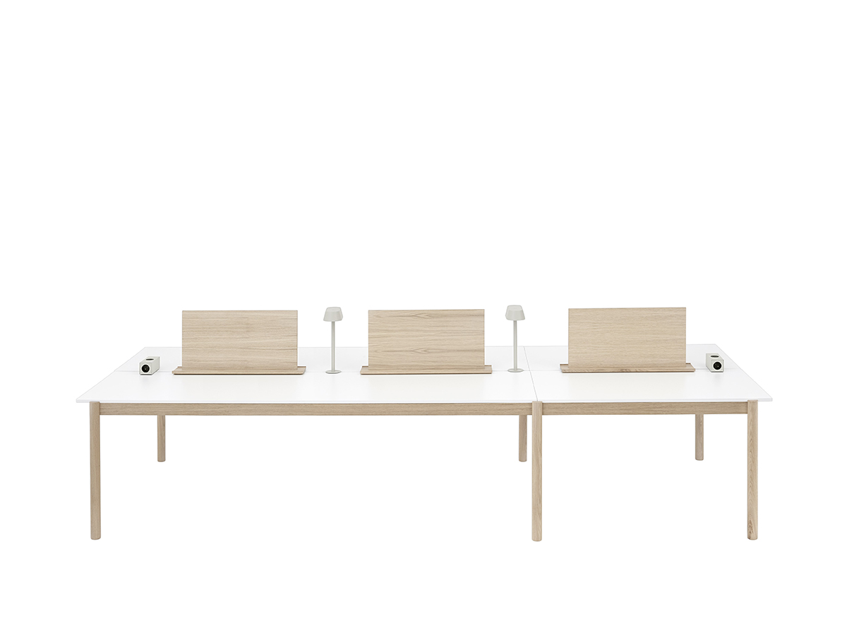 Die Trennwand passend zum Linear System schafft intime Atmosphäre, ohne von der Außenwelt abzuschirmen. Sie kann entweder freistehend oder mit Adaptern am Linear Tisch befestigt werden.
