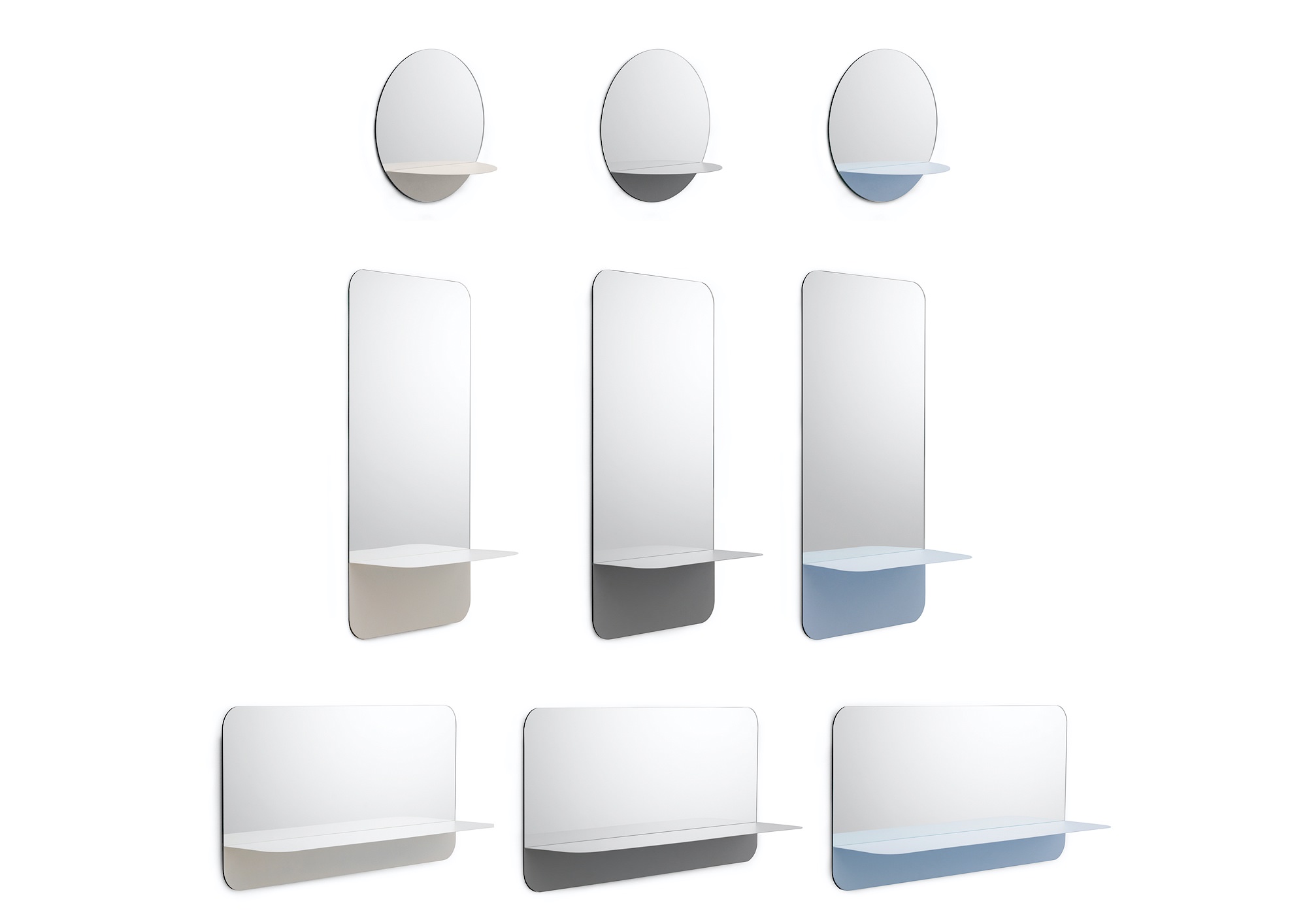 Horizon ist eine Serie aus Wandspiegeln in verschiedenen geometrischen Formen mit integrierter, reflektierender Ablage. Geeignet für die Garderobe, im Bad oder in der Ankleide.