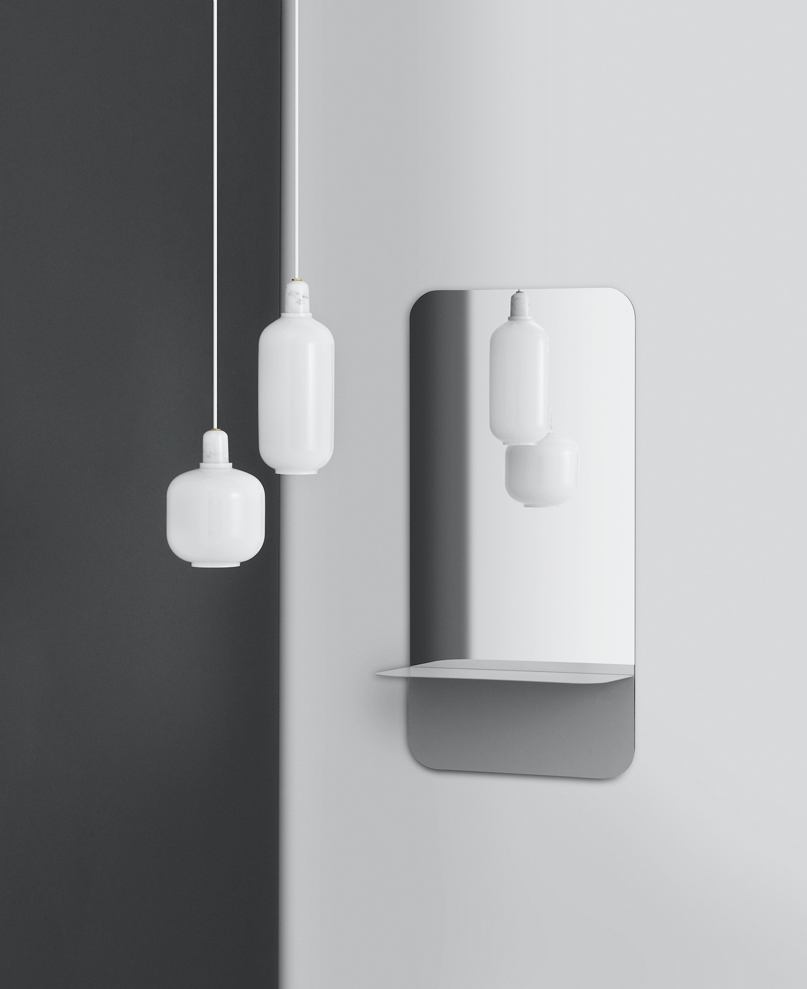 Die Idee entstand, als Designer von KaschKasch Modelle aus Papier gefaltet haben und dabei an die Linie des Horizonts dachten, die man am Meer sieht. Durch die Reflexion im Spiegel wird dem Horizont des Stahlregalbodens Tiefe verliehen. Objekte die auf dem Regalboden stehen werden durch den Spiegel verdoppelt, so entsteht ein interessanter Eindruck von Räumlichkeit. Der integrierte Regalboden aus Stahl ist in den Farben Weiß, Grau oder zartem Hellblau erhältlich.