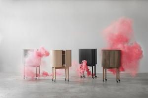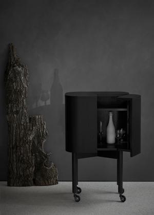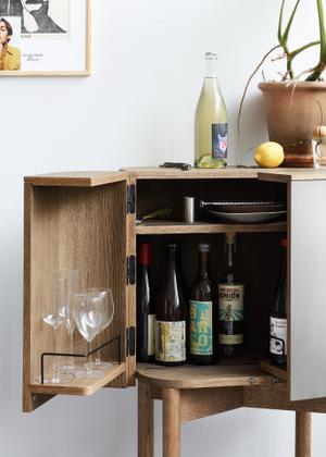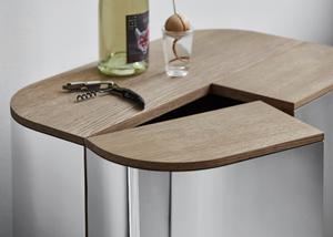 Der Barschrank Loud mit einer nahtlosen Schicht aus Aluminiumlaminat und aus edler geräucherter Eiche ist - anders als sein Name vermuten lässt - ein zurückhaltend und stilvoller Bergleiter, der für Ordnung sorgt.