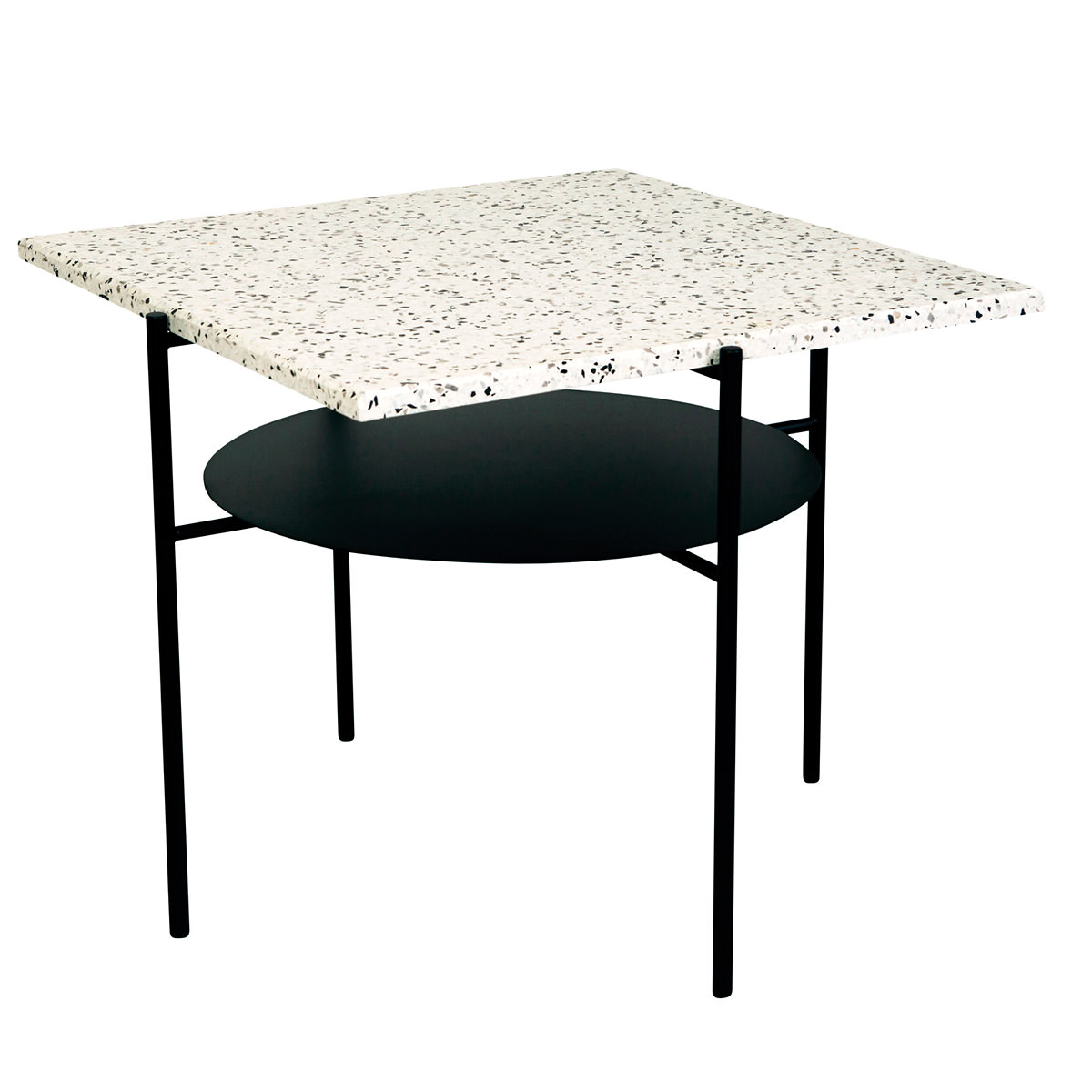 Hinter der Bezeichnung Terrazzo steckt ein Werkstoff aus Beton, der mit Farbakzenten angemischt wird. Beim Confetti Coffee Table wurde der helle Beton mit schwarzen Partikeln versetzt.