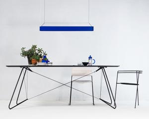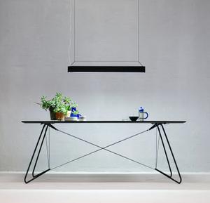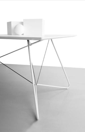 Der On a String Tisch von OK Design steht unter Spannung. Ein dünnes, gestrafftes Seil verbindet die beiden Enden des filigranen Gestells und sorgt für die nötige Stabilität. Der OAS eignet sich gleichermaßen als Ess- oder Schreibtisch.