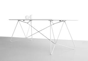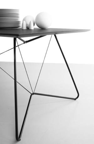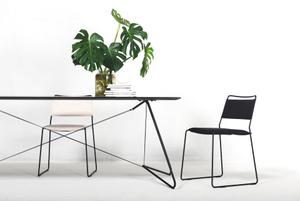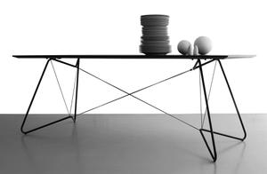 Der aus dem Hause OK Design stammende Tisch strahlt eine gewisse Eleganz und Klasse aus. Diese Designikone aus dünnen Metallstreben und den Schnüren setzt Akzente. Zusätzlich gibt es die Möglichkeit, Ersatzschnüre in den verschiedensten Farben einzusetzen. Der Tisch ist sowohl als Schreibtisch im Büro oder auch als Esstisch vielseitig einsetzbar. „On a String“ bezieht sich auf die originelle Idee, die hinter dem Tisch steckt. Die Fußkonstruktion und deren abgerundeten Winkel werden durch eine Verspannung miteinander getragen.