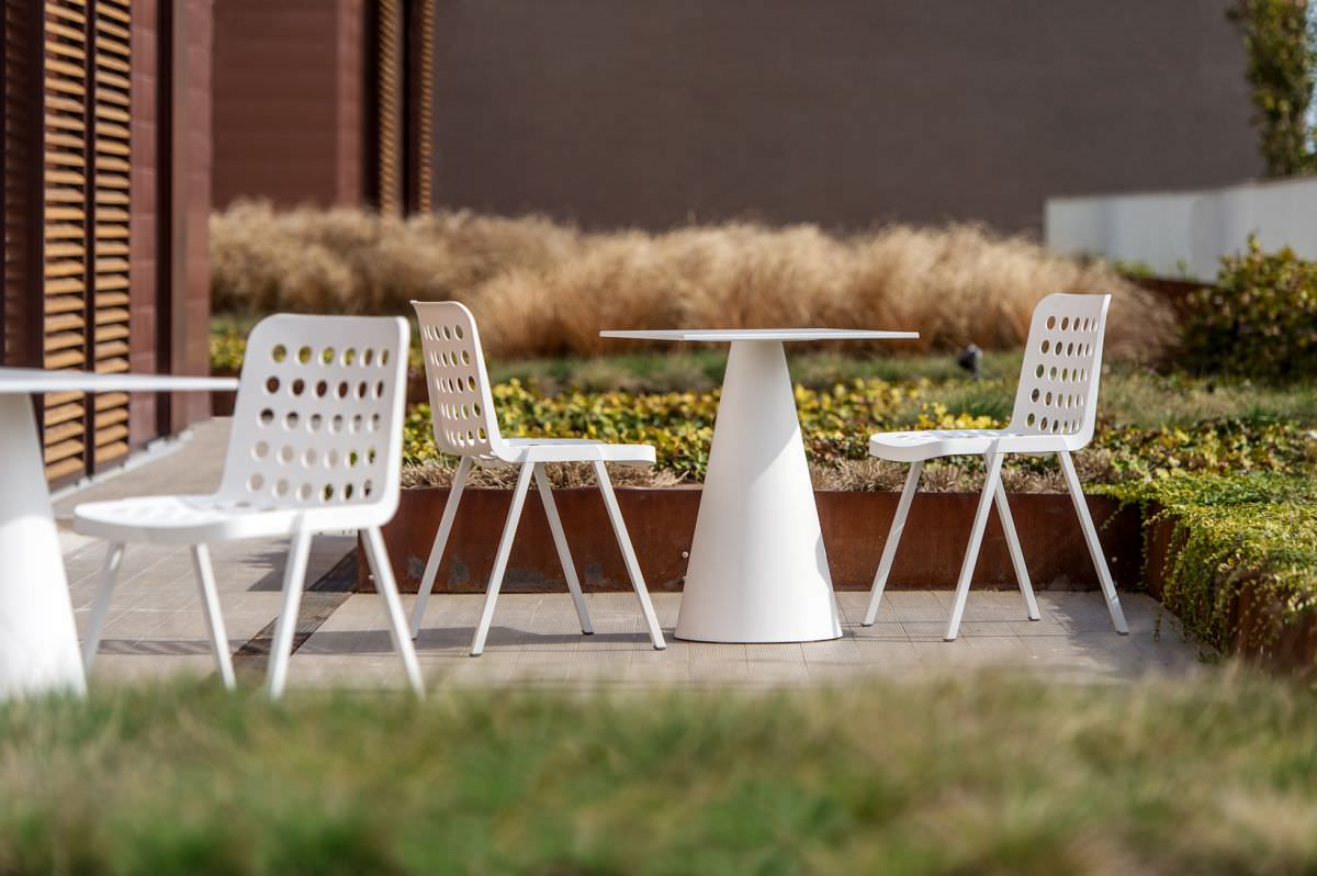 Erkennungsmerkmal sind eindeutig die vielen Löcher sowohl in Sitzfläche als auch Rückenlehne. Doch sie dienen nicht nur als optischen Blickfang, sondern sorgen auch dafür, dass das Regenwasser optimal abläuft. Die Koi-Booki Stühle sind leicht und zudem praktisch aufeinander stapelbar. Diese Eigenschaft zusammen mit der zusätzlichen Möglichkeit Verbindungsstücke zwischen den Stühlen anzubringen, etabliert sie verstärkt als Konferenz oder Seminarstühle.