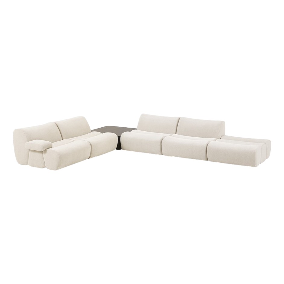 Der modulare Ansatz führt zu einem Sofa, das mit weichen, unstrukturierten Formen an ein Daunenkissen erinnert und zugleich natürlichen Komfort bietet. Es wurden bewusst besonders weiche und bequeme Stoffe ausgewählt, darunter auch Samtmaterialien.