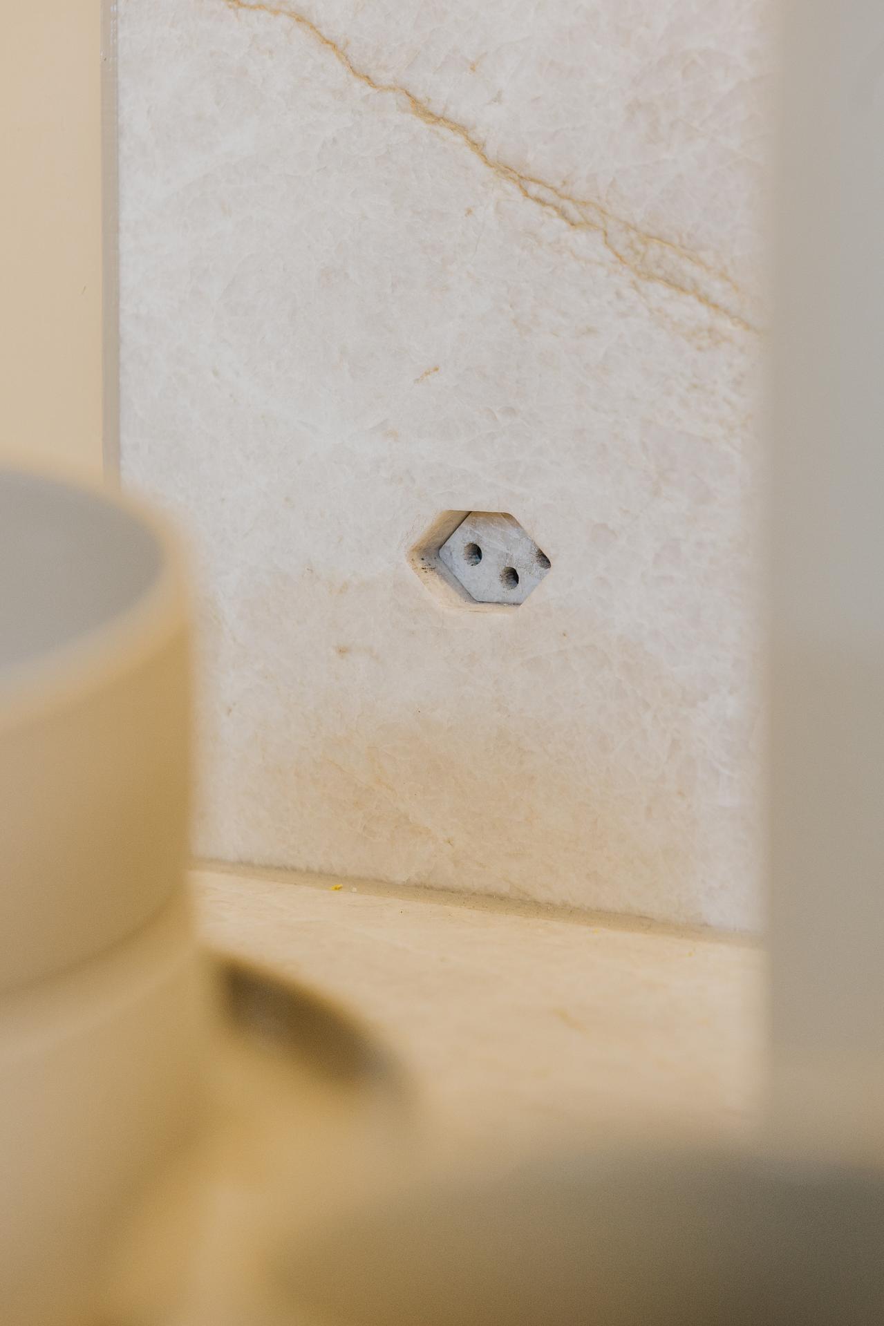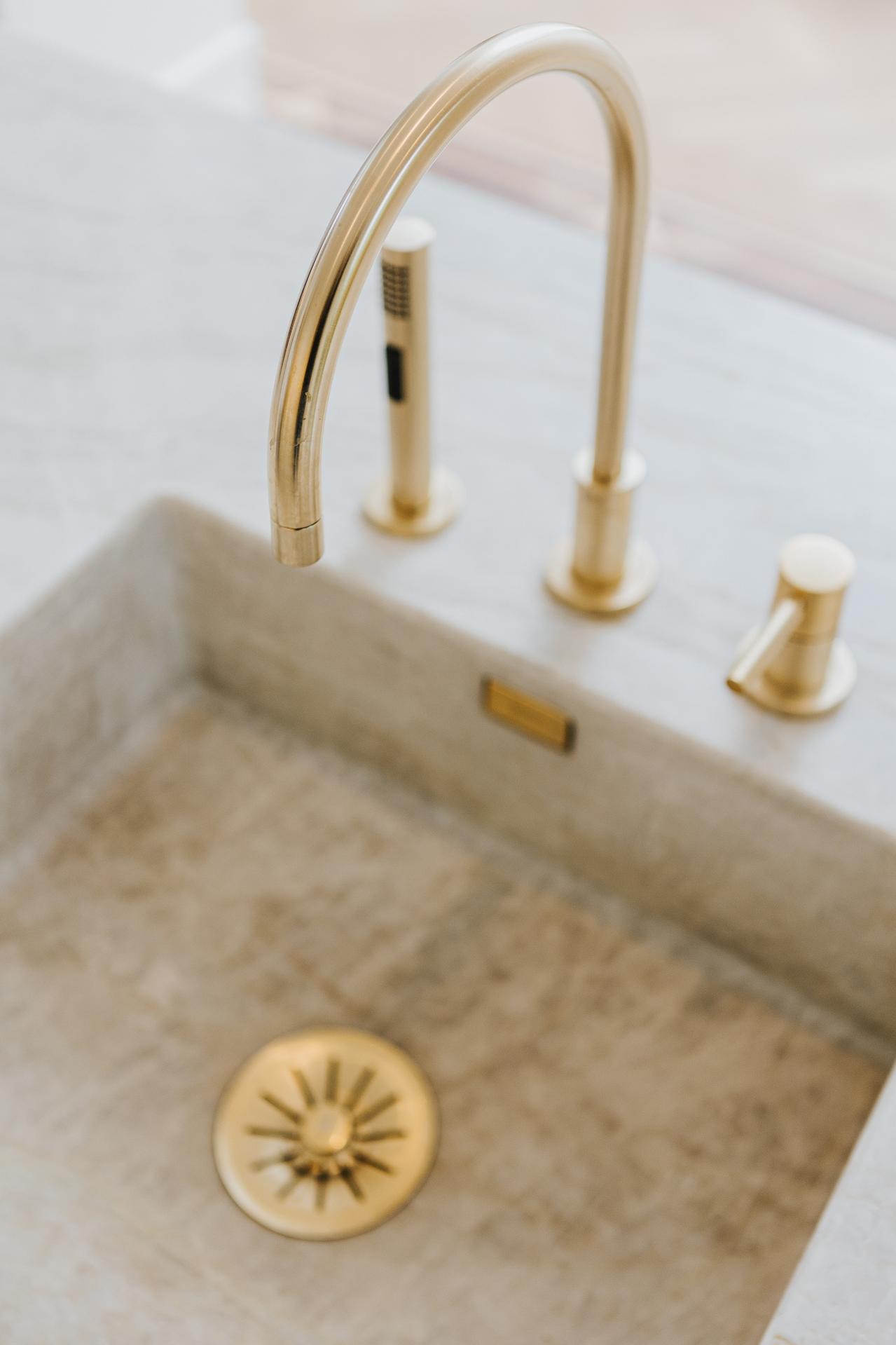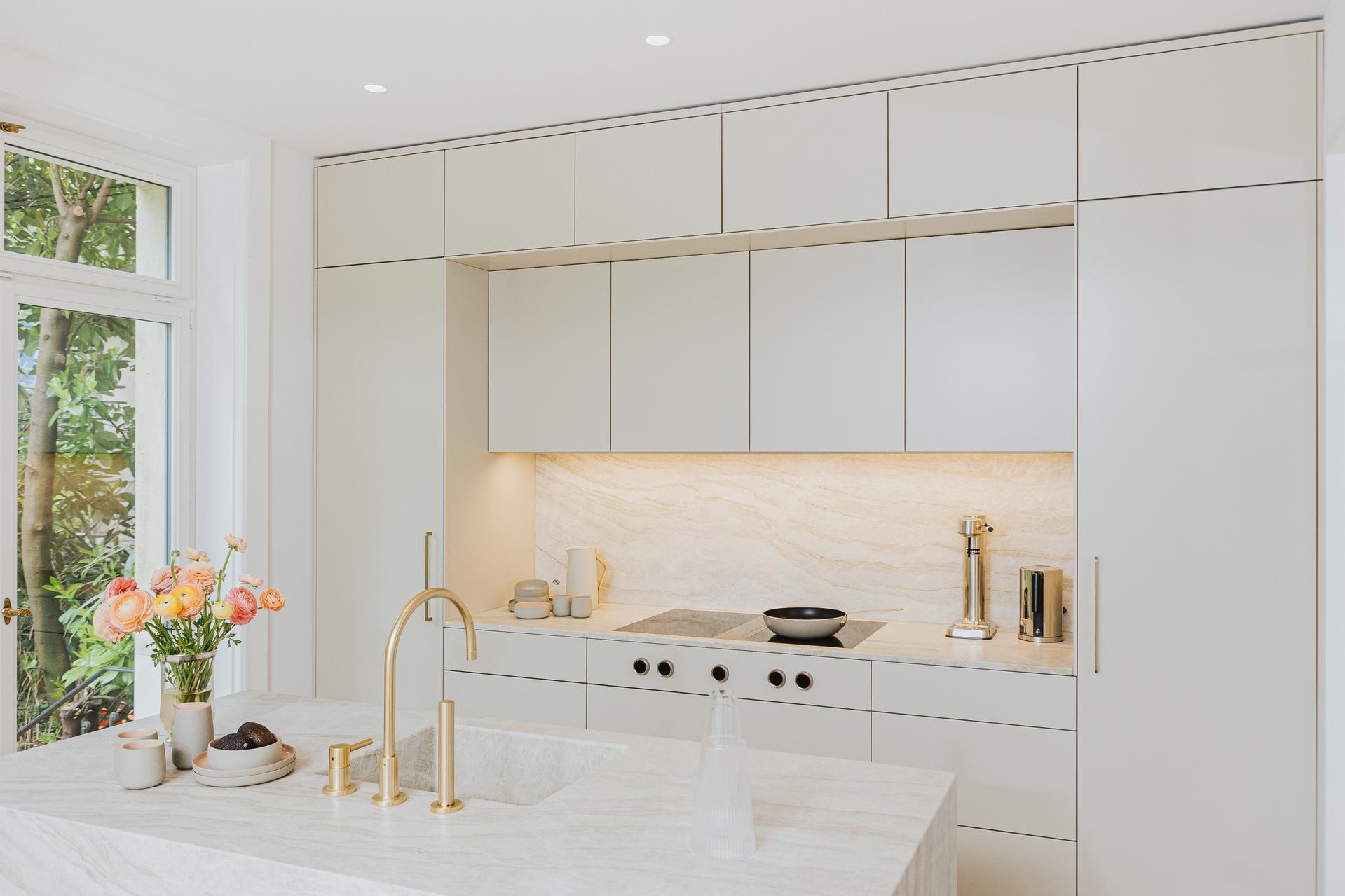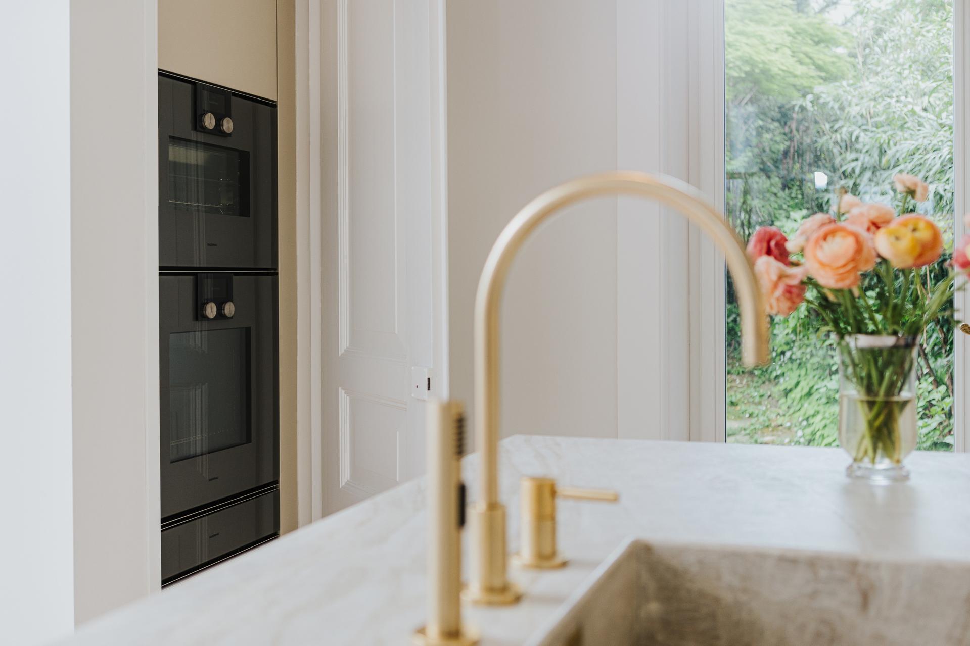 So wurde die geliebte Siebträgermaschine mit Festwasseranschluss in einem Wandschrank mit Auszugstablar untergebracht, um maximalen Komfort zu bieten. Auch die goldveredelten Details am Waschbecken, passend zur Dornbracht-Armatur, setzen einen besonderen Akzent und konnten als Sonderanfertigung realisiert werden.