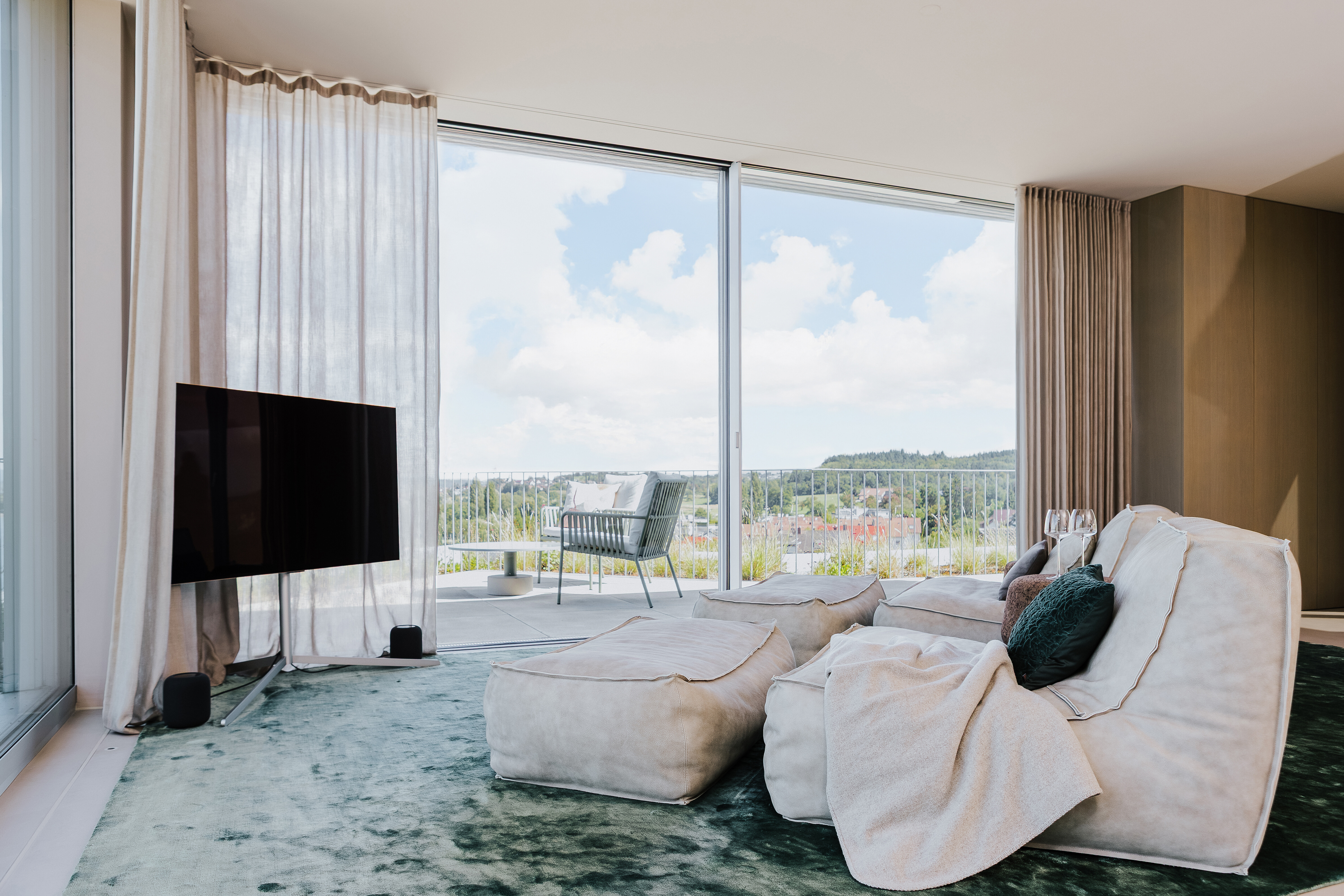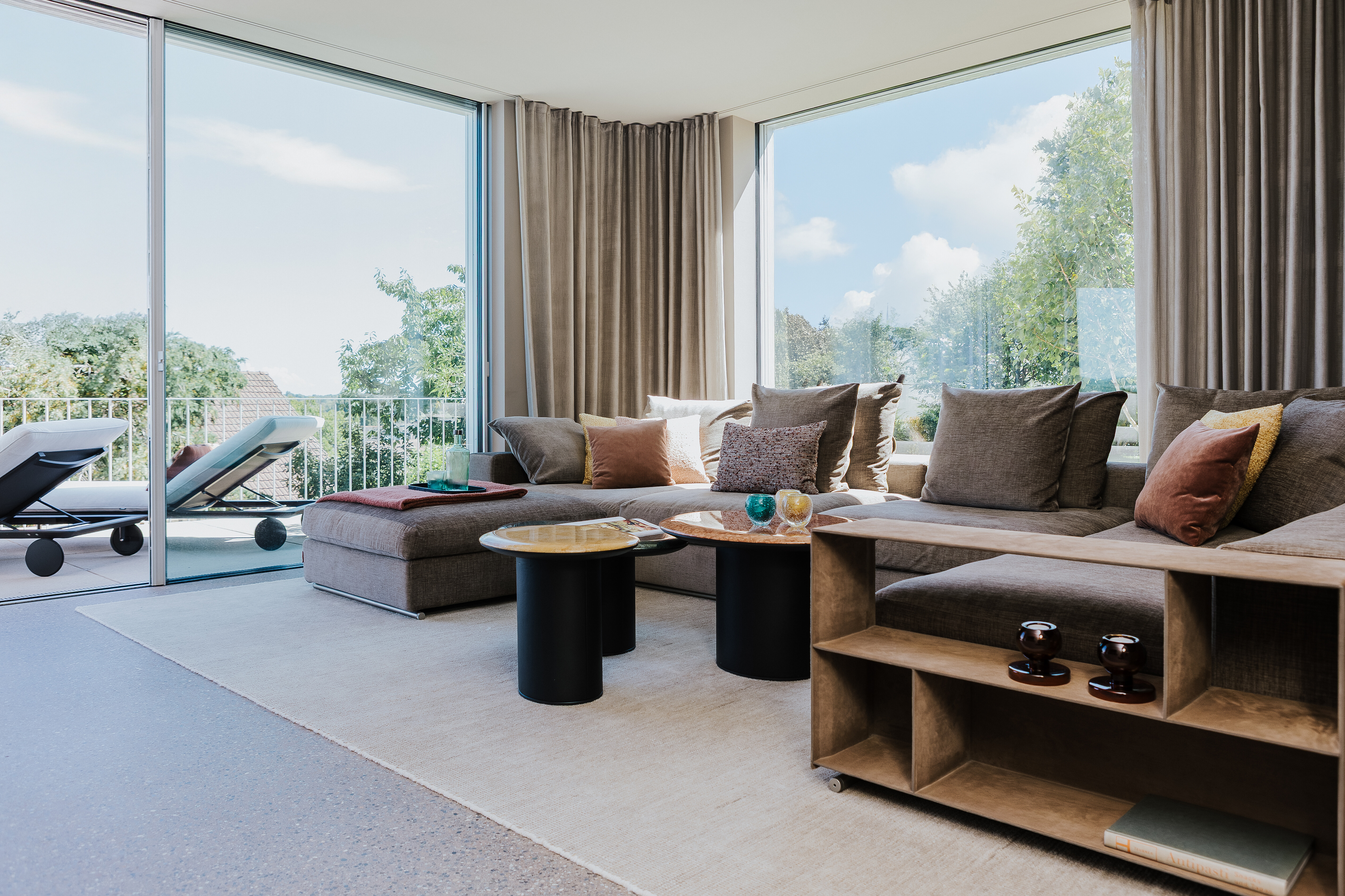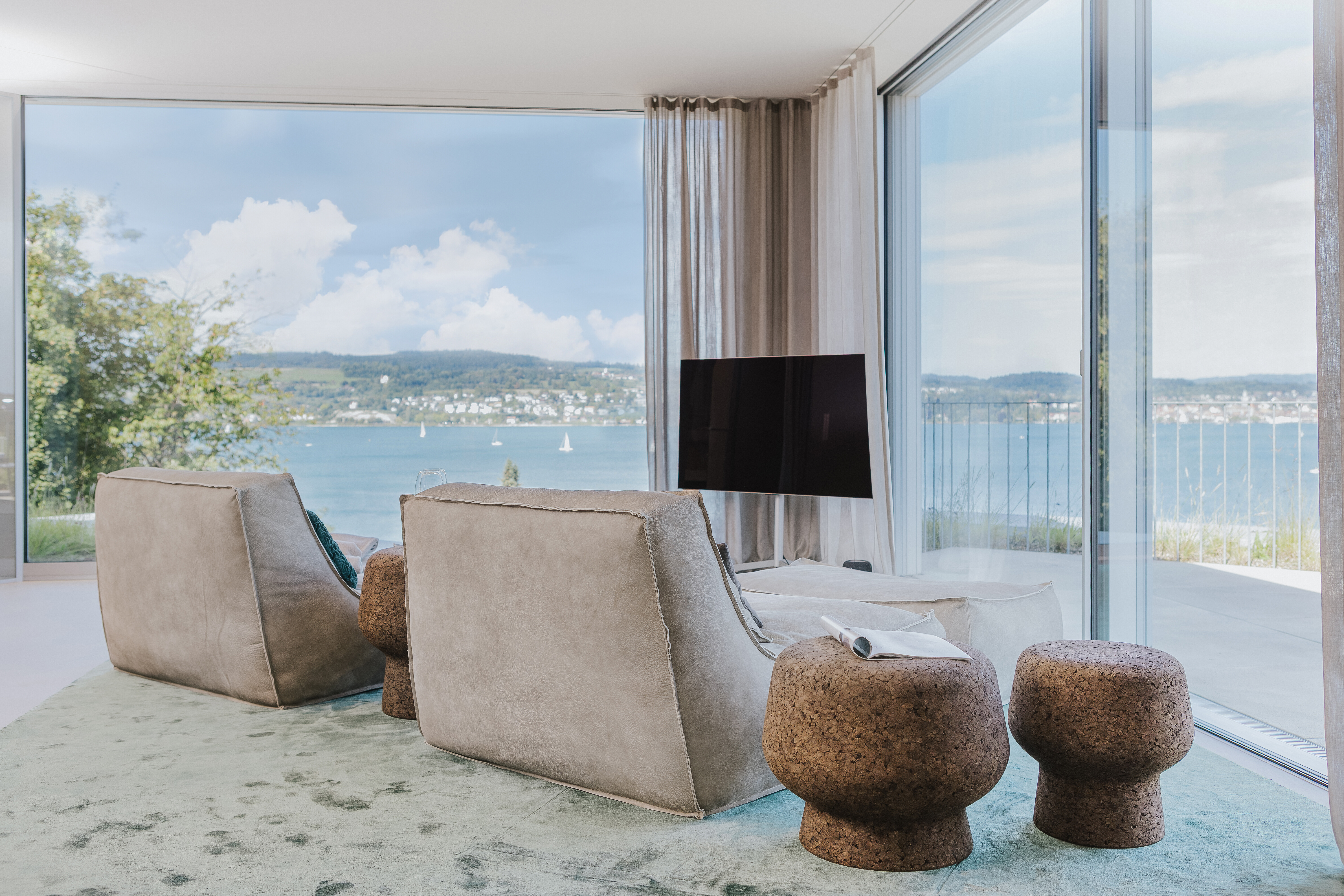 Im oberen Bereich des Hauses lädt ein zweiter Lounge-Bereich zum Rückzug ein. Zwei weich gepolsterte Chaise Longue Zoe More Large von Verzelloni bieten dort maximale Bequemlichkeit – leger, aber stilsicher. Die markanten Beistelltische Corker von ClassiCon setzen dazu einen kontrastreichen Akzent in Form und Material. Ein samtiger Teppich in einem tiefen Blaugrün verbindet das Setting optisch mit dem Ausblick: Er spiegelt die Farbigkeit des Bodensees wider und verleiht dem Raum eine zusätzliche Tiefe.