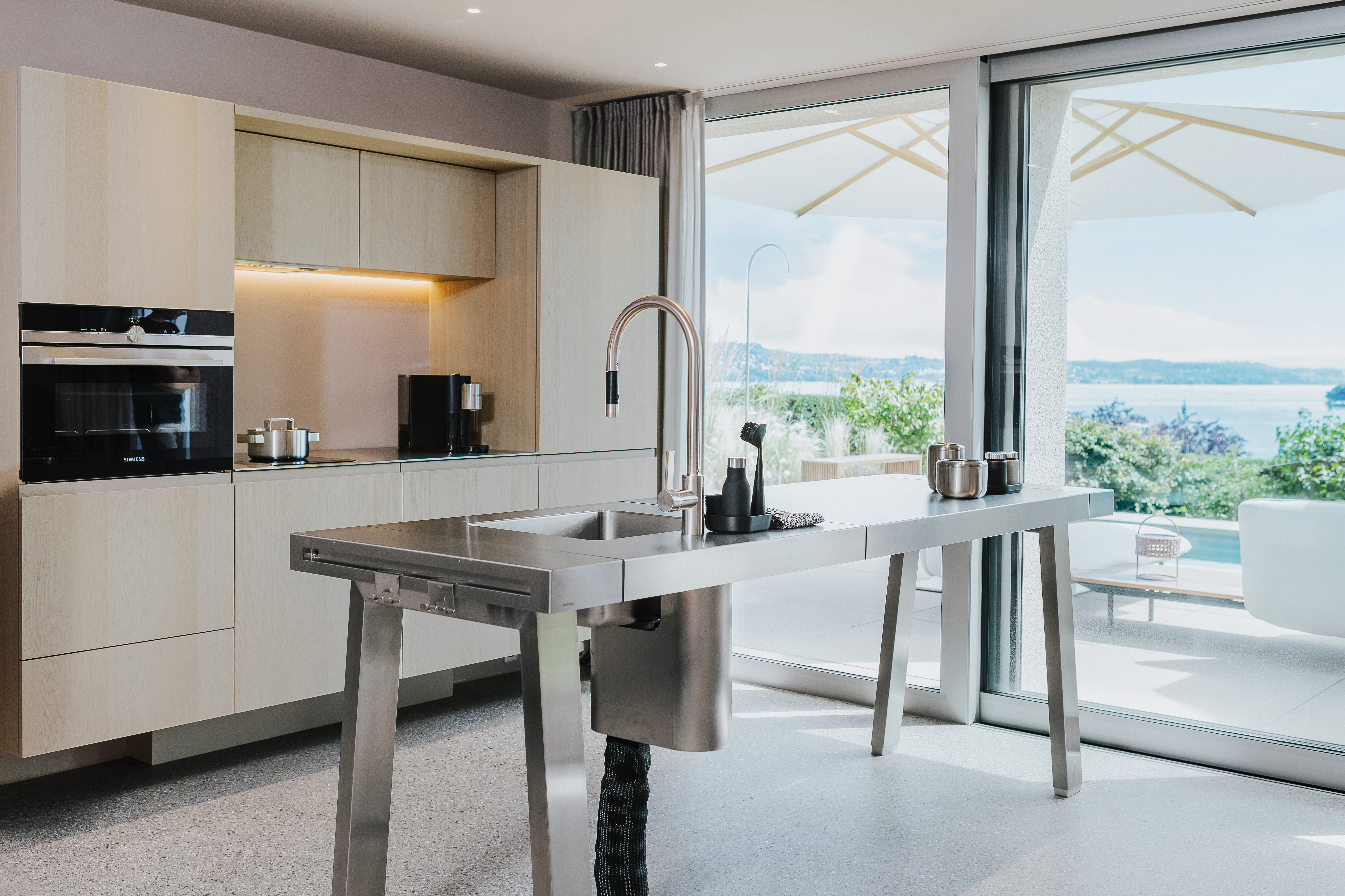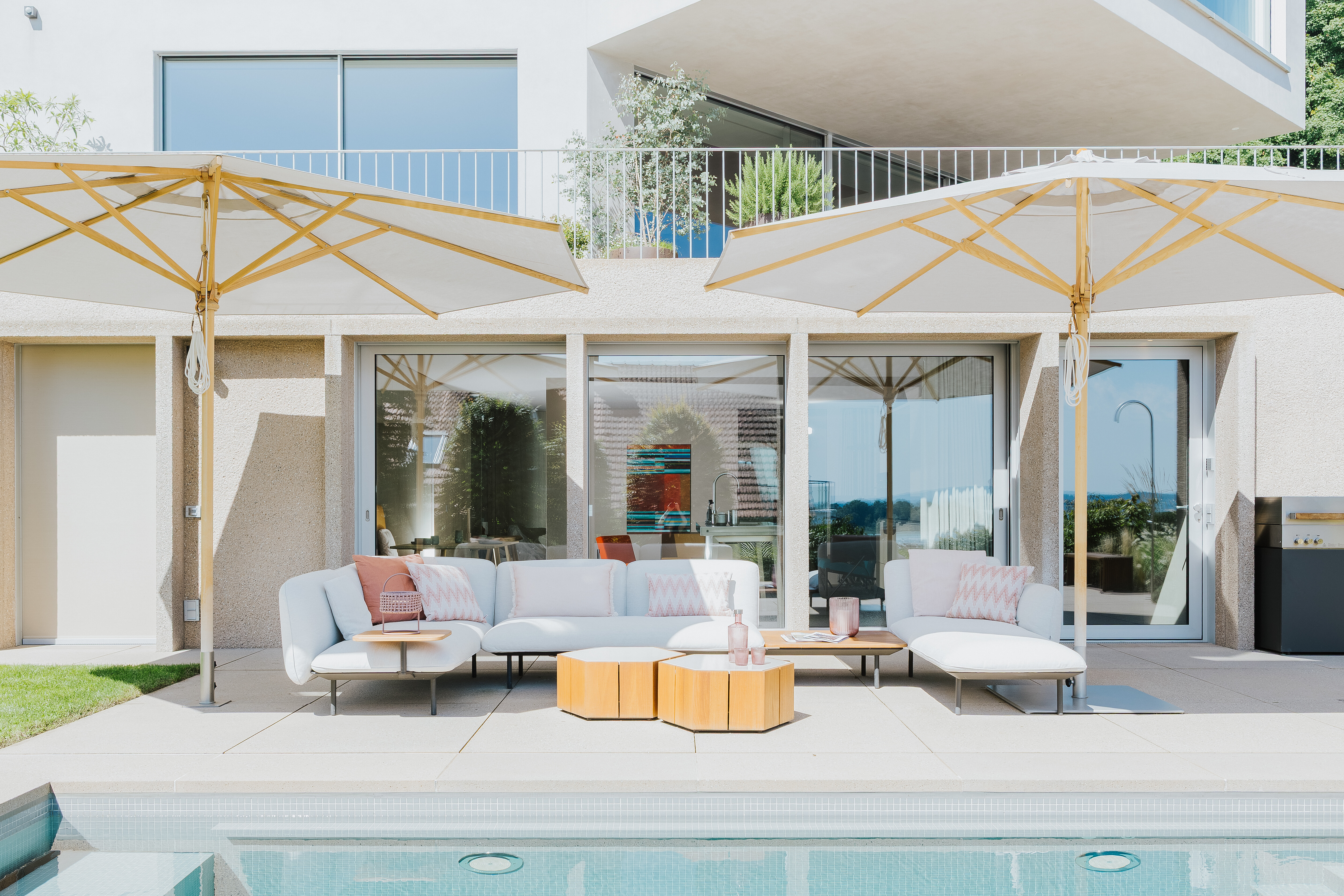 Das Herzstück des Außenbereichs bildet zweifellos die großzügige Poollandschaft mit uneingeschränktem Blick auf den Bodensee. Hier fügt sich das modulare Outdoor-Sofa Senja von Tribù in sandigem Farbton elegant in die Umgebung ein. Zwei Hexagon-Beistelltische aus dem gleichen Hause ergänzen die Sitzgruppe mit organischer Geometrie und bieten Platz für sommerliche Kleinigkeiten.