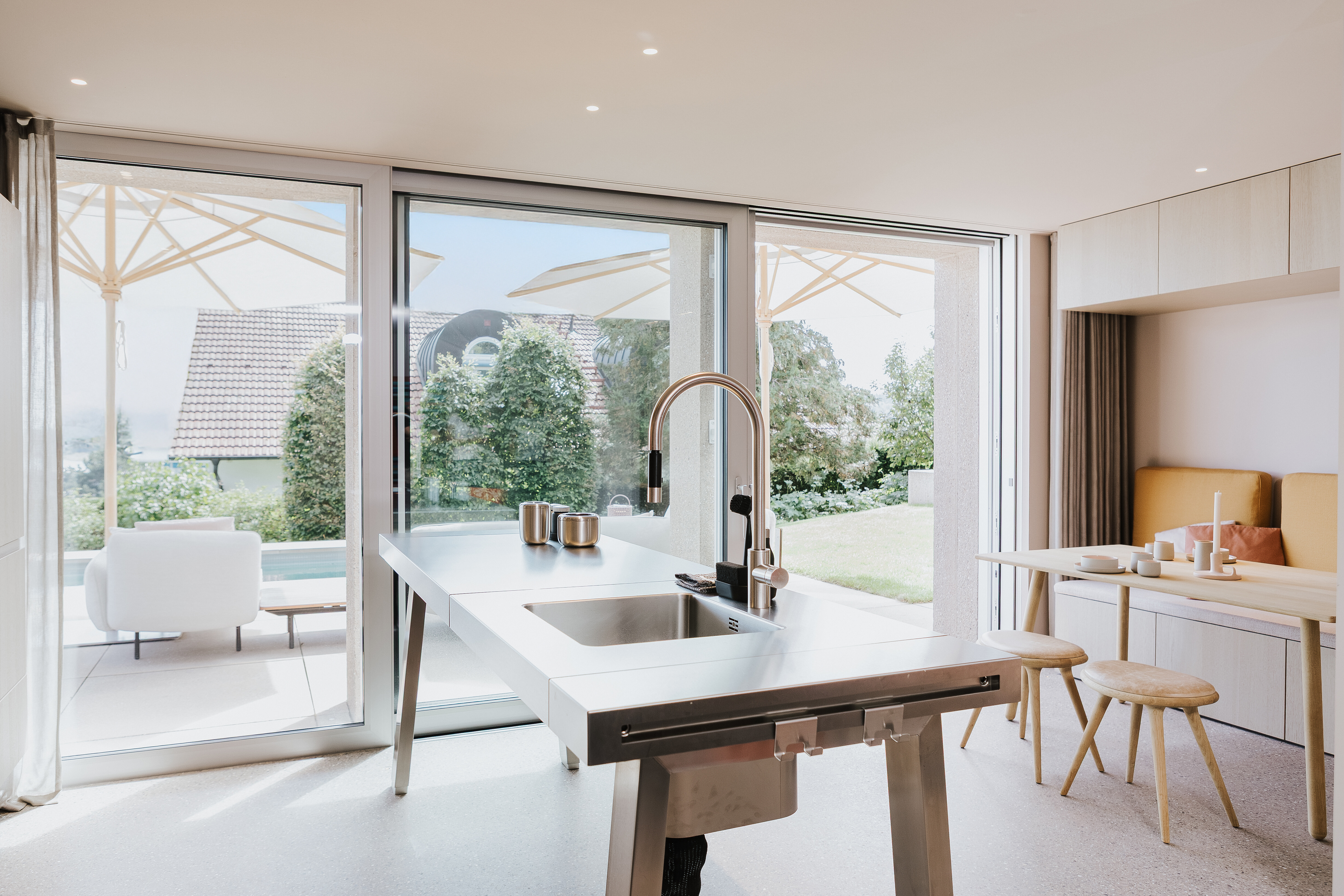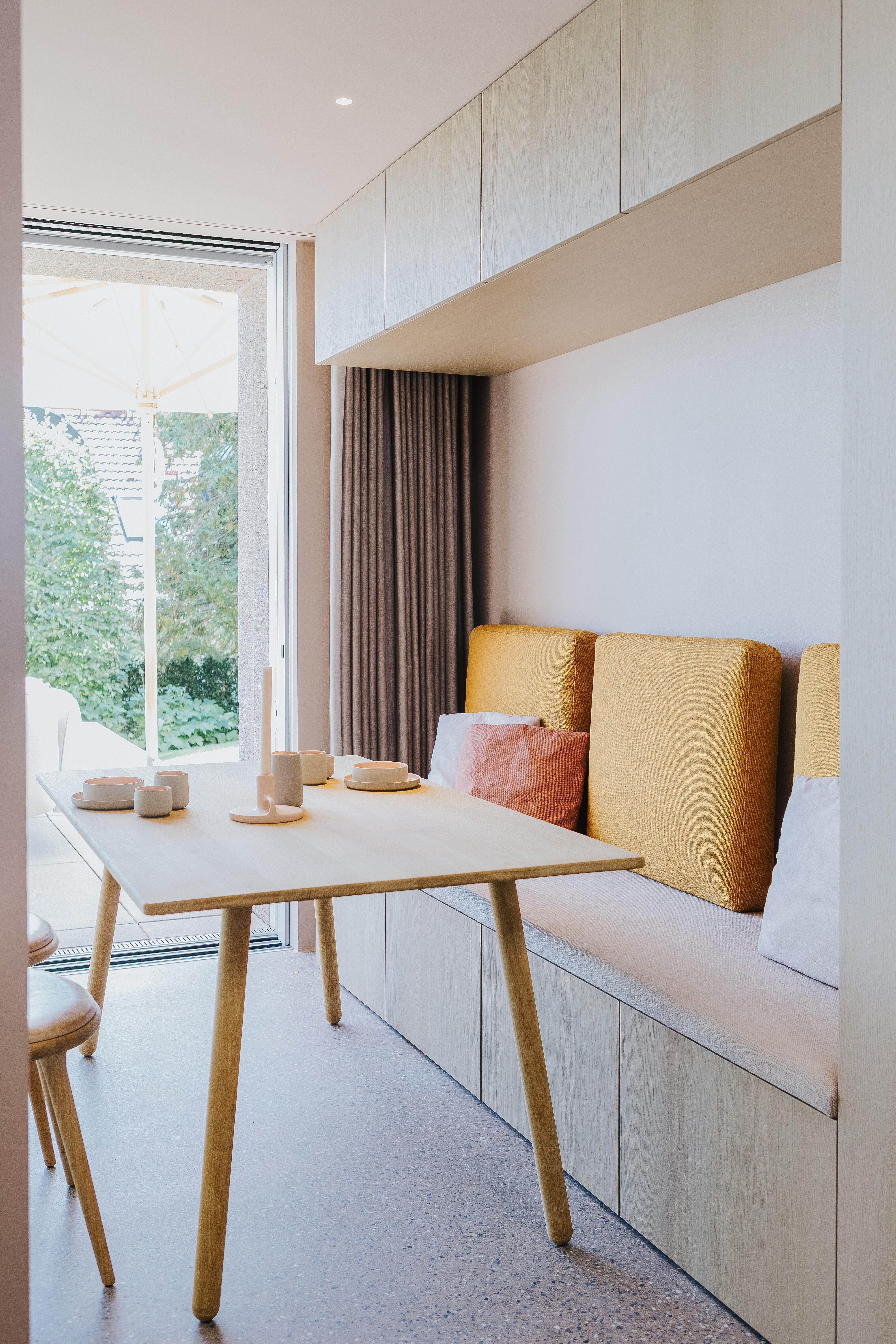 Eine angrenzende Sitzecke mit integriertem Wandmodul, einem schlichten kleinen Holztisch und zwei ergänzenden Holzhockern schafft einen zurückhaltenden, fast skandinavisch anmutenden Ort zum Frühstücken, Lesen oder für das schnelle Mittagessen mit Blick ins Grüne.